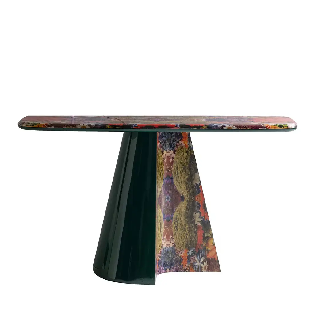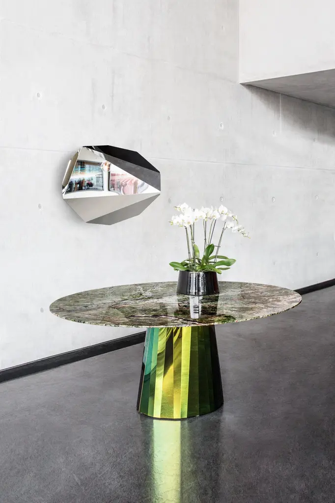 With the Pli table series French designer Victoria Wilmotte brings objects of unusual crystalline elegance and astonishing geometry to living environments, dining rooms or entrance areas. The bends and folds that gave Pli its name almost make the stainless steel base look like an oversized finely polished precious stone. The table’s oval forms of the base and tabletop establish an attractive contrast with the facets of the base, which create a fascinating play with light friction and color reflections in the room. The Pli Table can be used as a representative dining table for up to eight persons. In the entrée or foyer, galleries and stores the table can also be used as a spectacular eyecatcher.Materials: Base made of folded, high-gloss polished stainless steel sheet, tinted with a special method. Oval tabletop made of crystal glass, fully color-lacquered, glossy. Height-adjustable felt gliders in black.Dimensions: W 180 x 140 cm, H 74 cm.