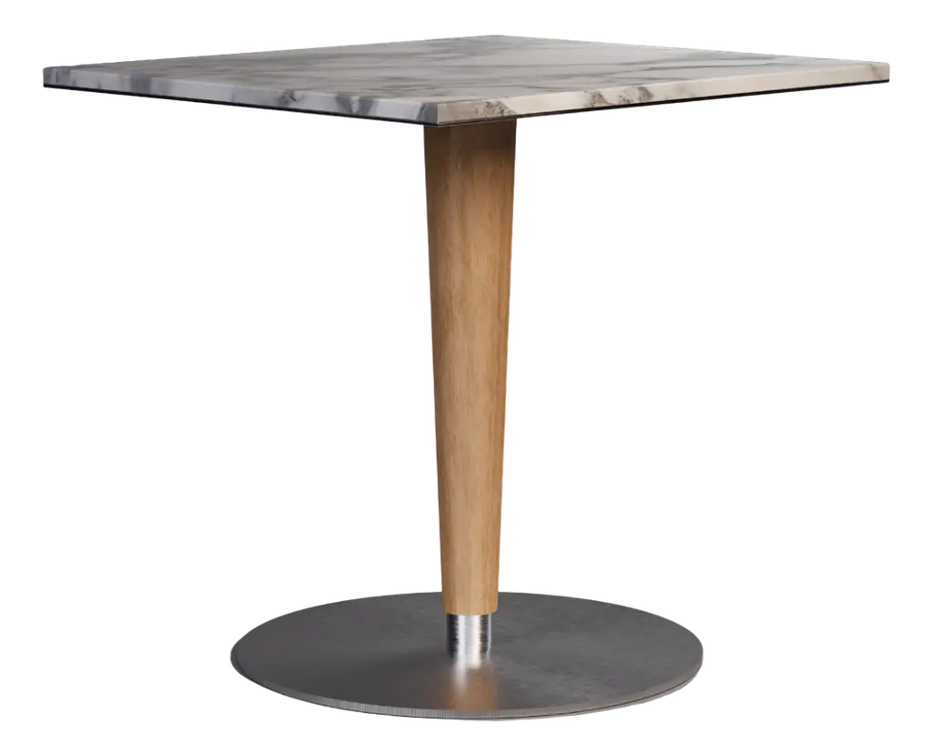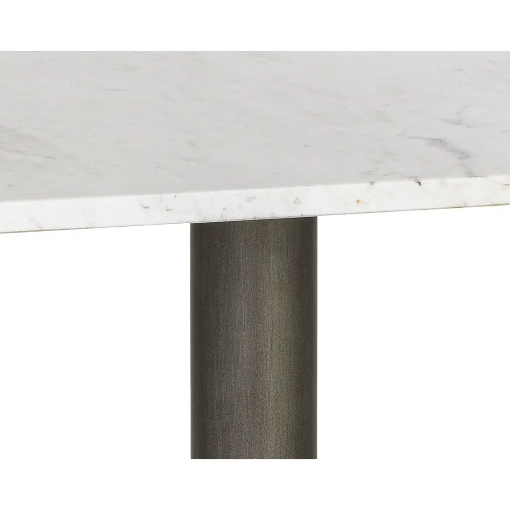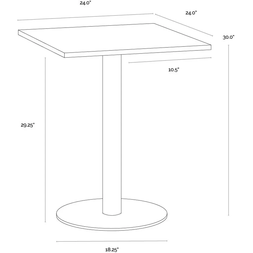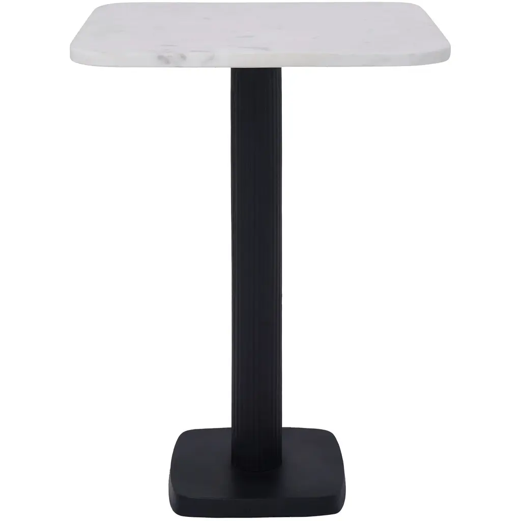 An Art Deco inspired 24" square bistro table featuring a white marble top with a pewter finished steel base. Perfect for restaurants and smaller dining spaces. As marble is a natural material, unique veining, pitting, fissures, micro-cracks and colour variations are all characteristics that add to the uniqueness and beauty of each piece.