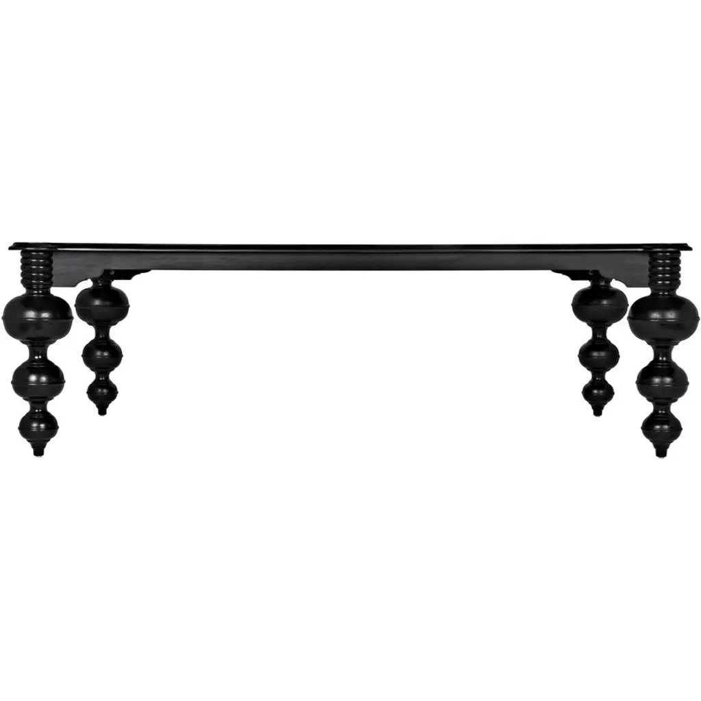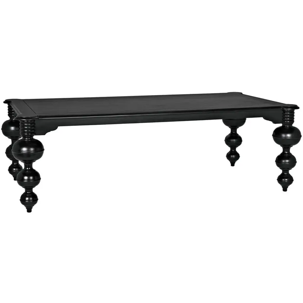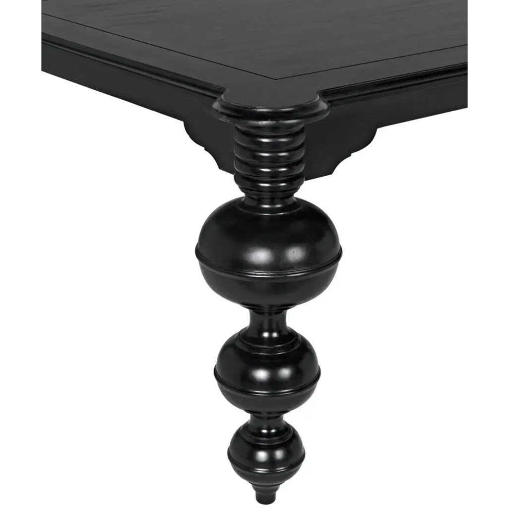This spectacular dining table has been expertly hand-carved of solid mahogany with a deep, hand-rubbed black finish. Its extravagantly turned legs dazzle, and are mirrored in the rounded corners of its rectangular top