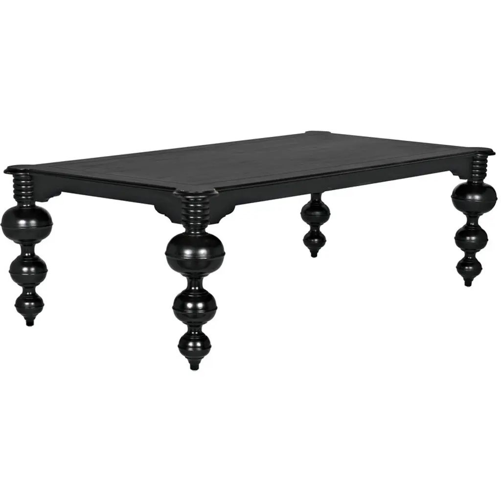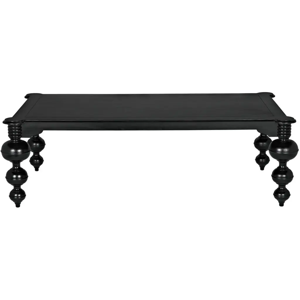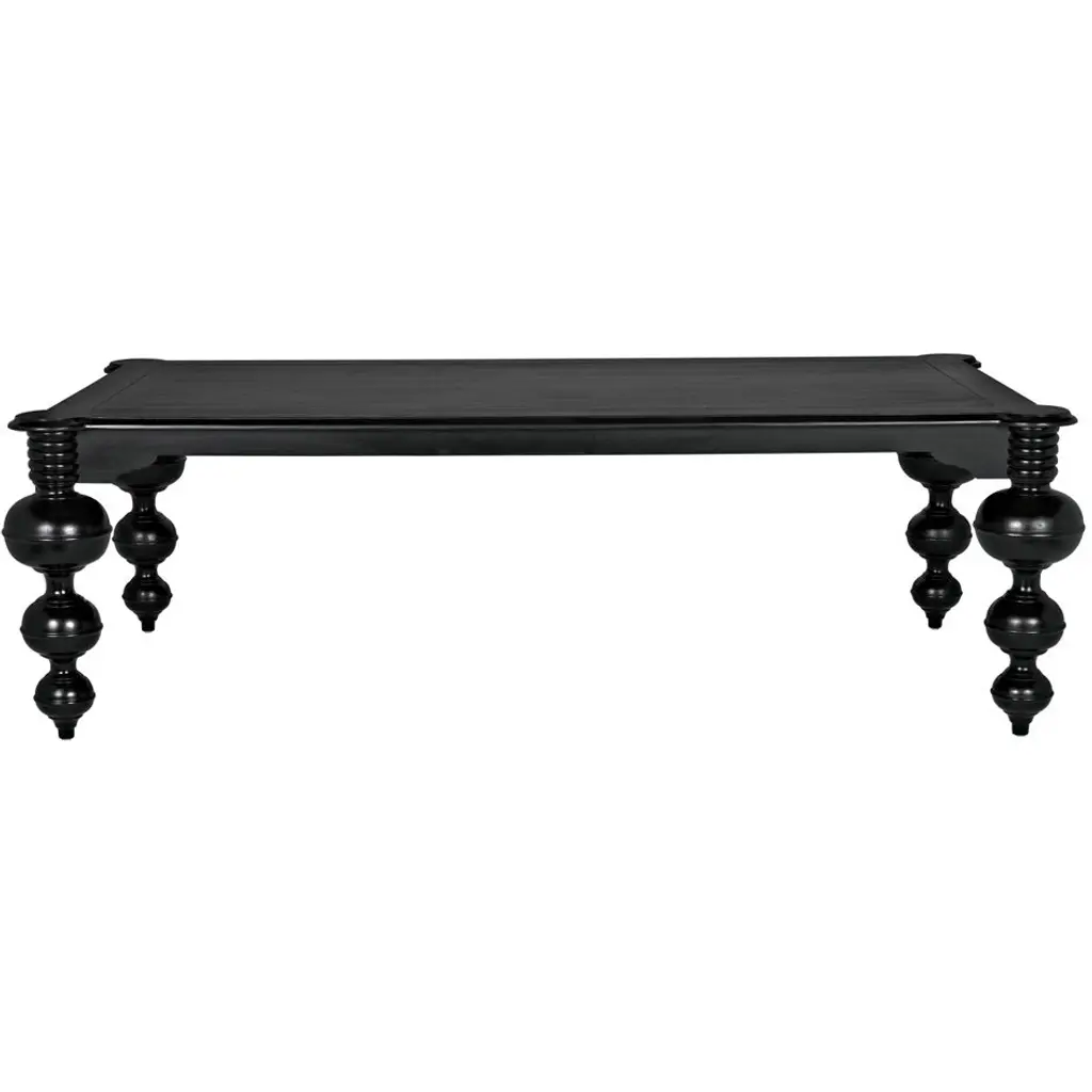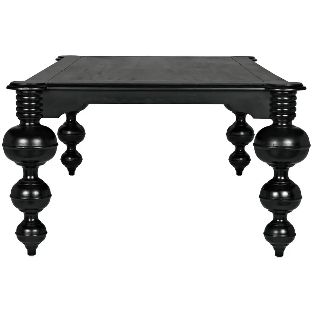 This spectacular dining table has been expertly hand-carved of solid mahogany with a deep, hand-rubbed black finish. Its extravagantly turned legs dazzle, and are mirrored in the rounded corners of its rectangular top