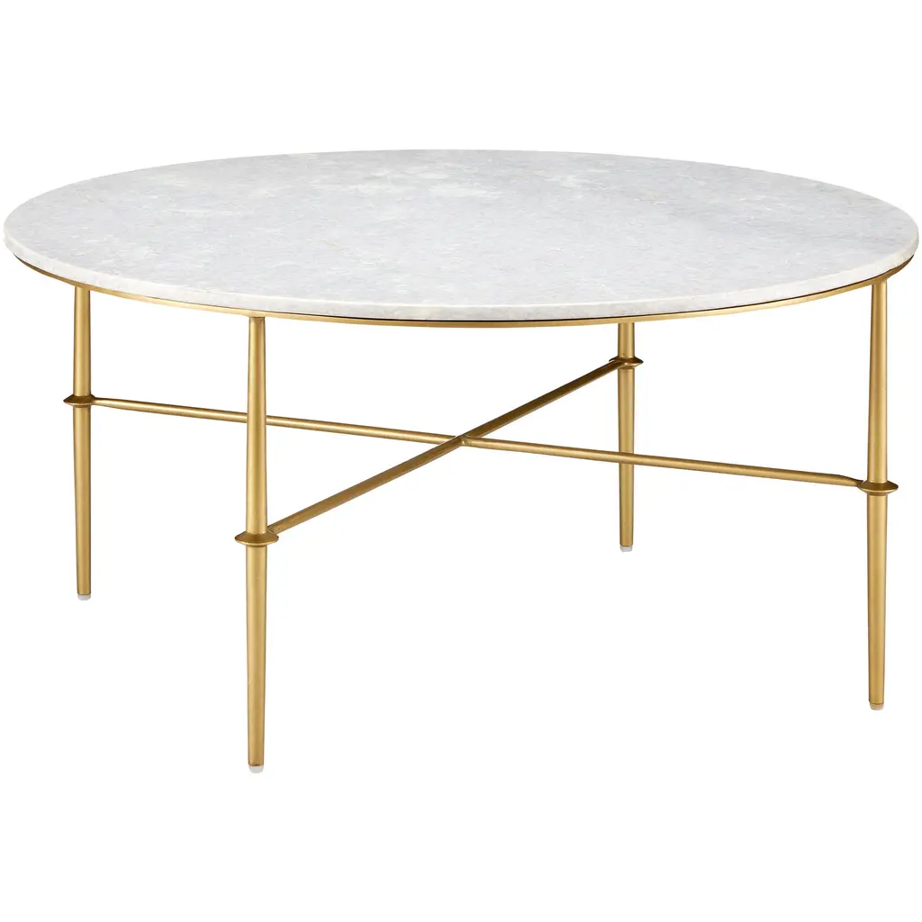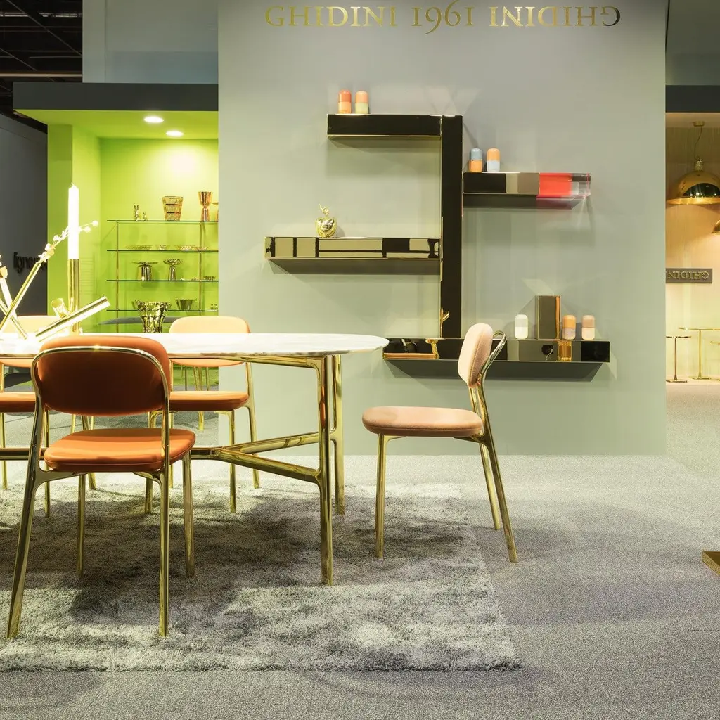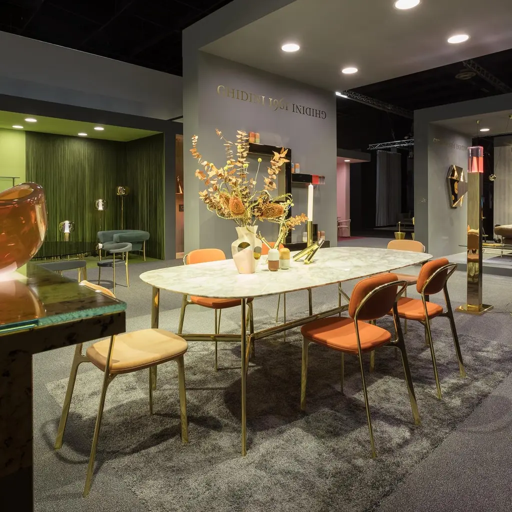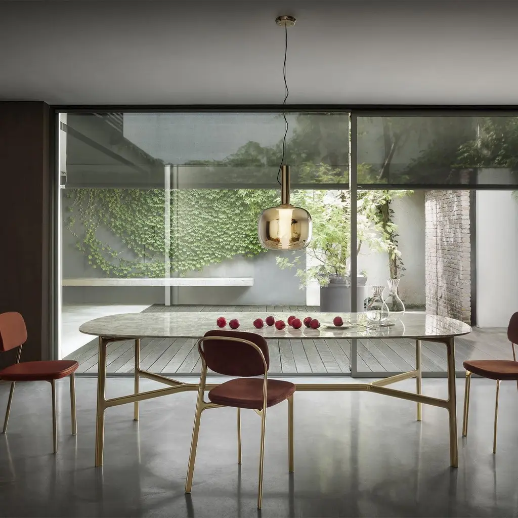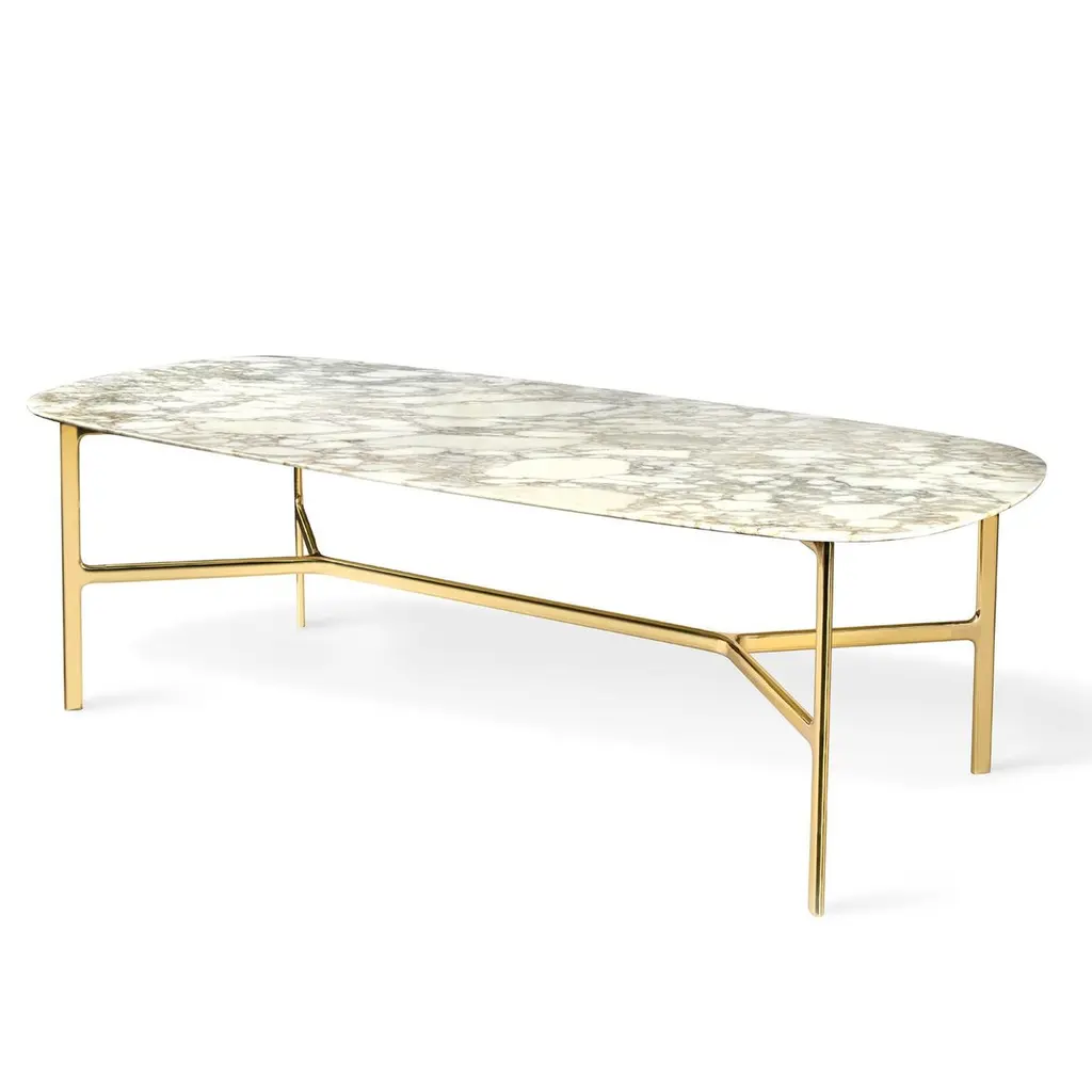 A striking combination of noble materials arranged in a modern and bold silhouette, this table is an eye-catching object of functional decor that will stand out in a contemporary dining room. The brass base features linear elements joining in the center to function as a footrest and at the top to support the superb slat of Calacatta marble with round corners. The timeless color combination of these two materials is further enhanced by the one-of-a-kind veins of the precious stone.