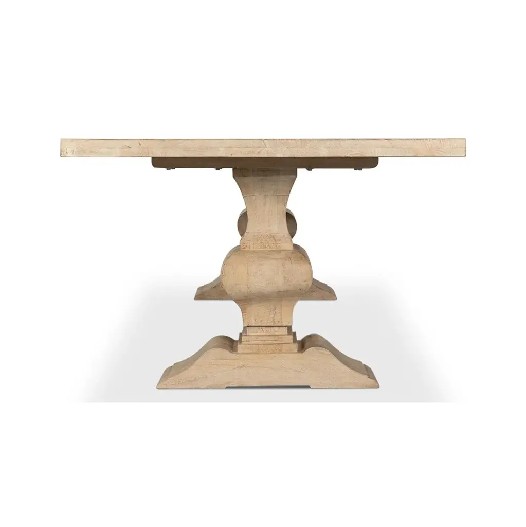 Coastal Style Refectory Dining Table, rich mango wood in a natural coastal style sienna finish, the rectangular old world style refectory dining table is raised on bold trestle and columns with a stretcher base. Dimensions: 94" W x 45" D x 31" H
