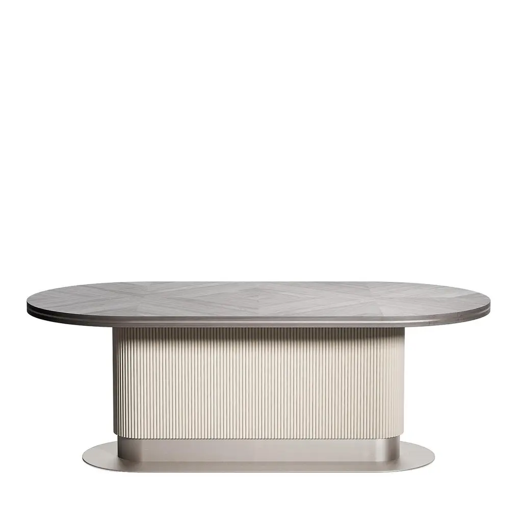 An ode to innovative design and traditional craftsmanship, this stately table will be the focal point of any modern-styled dining room. The inlaid veneer of the oval top has a striking diamond pattern and a slim brass-finished metal band around the border. The column-styled oval base is made of beige lacquered wood with fluted shafts with velvet-like finish and a grey metal supporting foot. The bold silhouette and soft contours imbue the piece with intrigue and timeless elegance. This sophisticated table will be ideal for hosting large parties or events.
