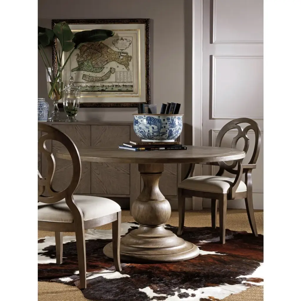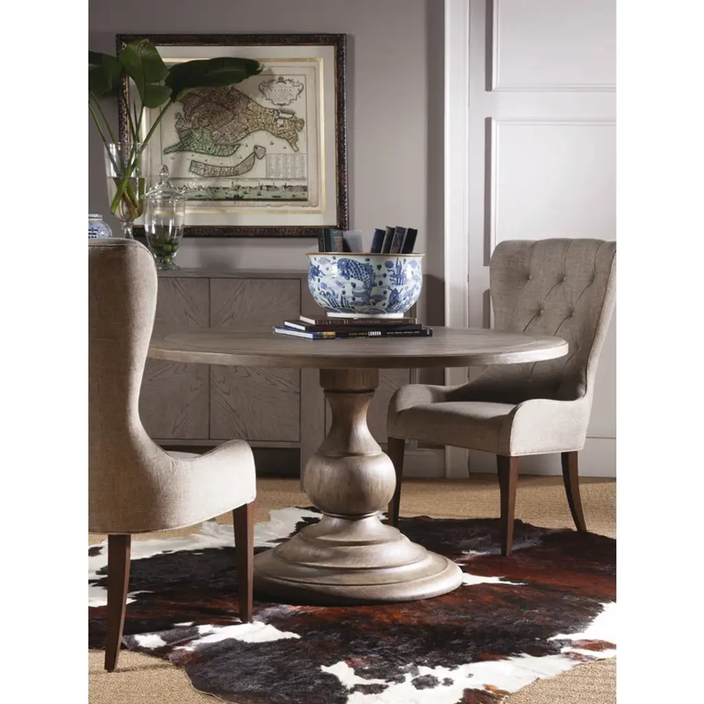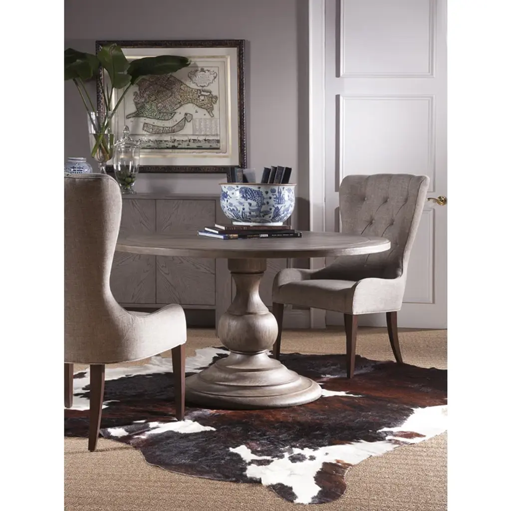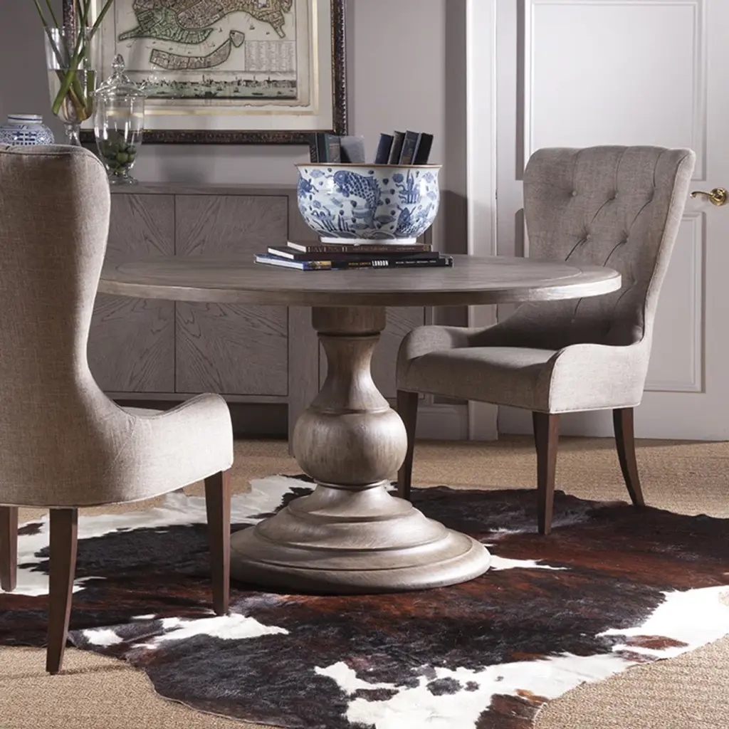 Casual design crafted from mahogany veneers and select hardwoods, a whitewash over wood tone with hand wire brushing. The roundtable seats five comfortably is scored for a plank effect and features an urn-shaped pedestal base.