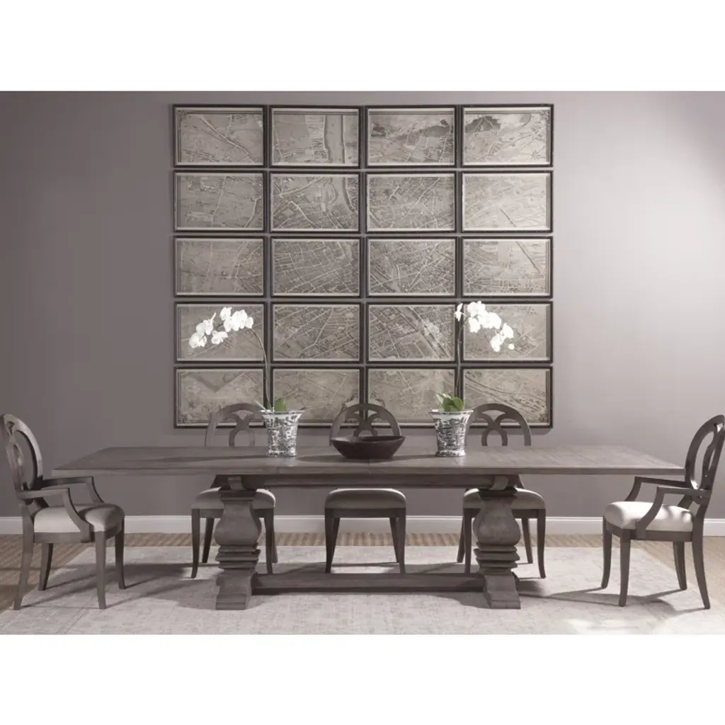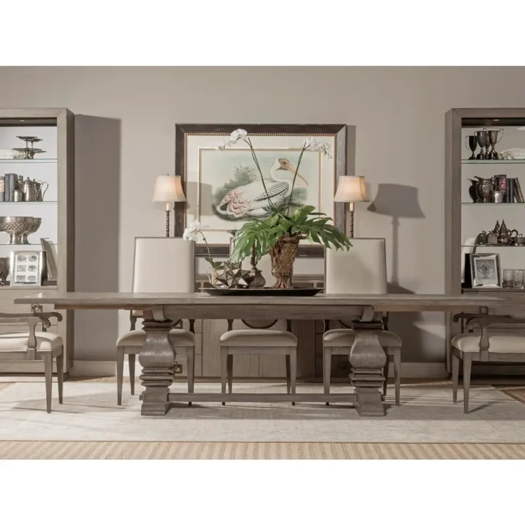 Casual designs crafted from mahogany veneers and select hardwoods. The Cohesion Program Extendable Dining Table extends with two leaves to seat 12 comfortably. The top features mitered corners and are scored for a plank effect balanced in design by the carved pedestal legs with a wooden stretcher.