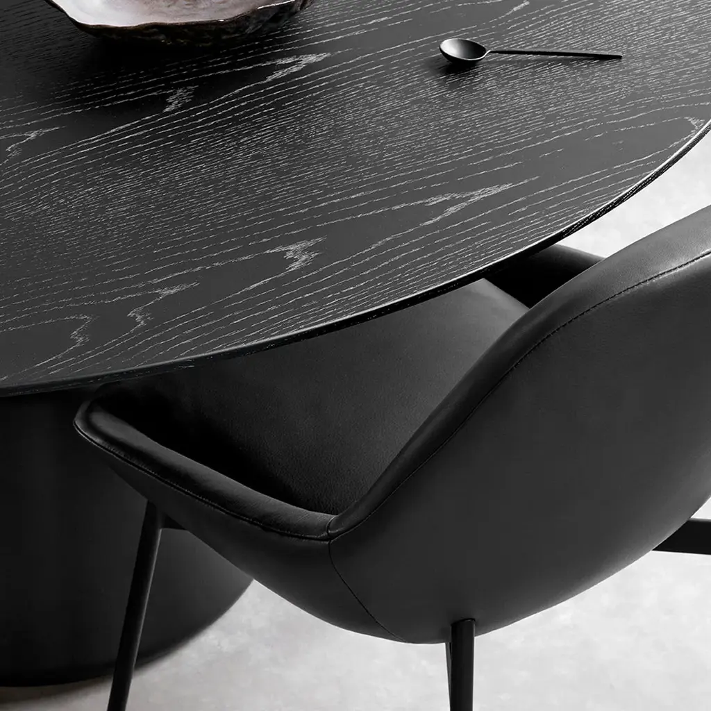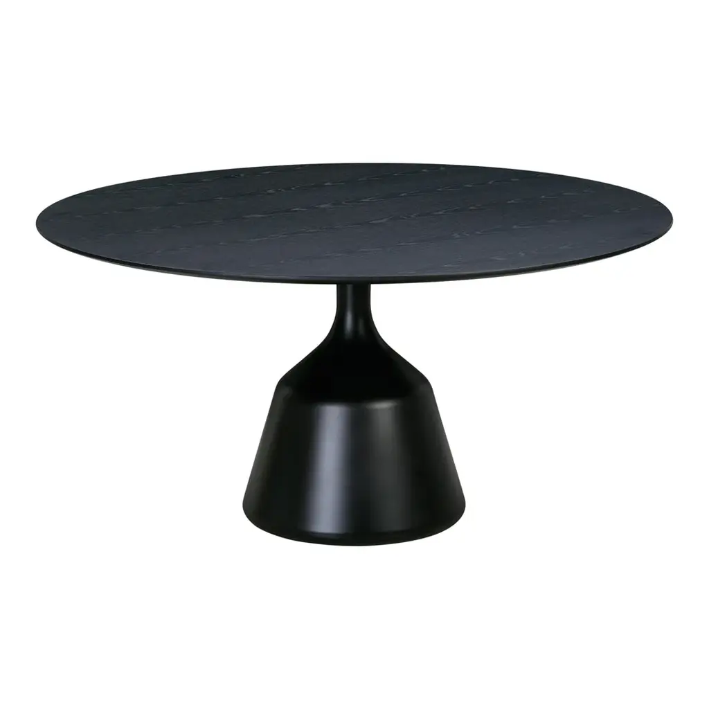 The Coin Dining Table transforms mathematical perfection into a sculptural centerpiece for contemporary dining spaces. Designed by Henrik Pedersen of 365° North, this table masterfully fuses circular and conic-shaped components to create a bold geometric presence that commands attention while maintaining visual harmony. The table's defining feature is its distinctive cast aluminum basean amplified silhouette of the collection's side tablesthat provides exceptional stability through its precise conical form. Available in sophisticated finish options including black with burnished brass, solid black powder-coating, or dark brown powder-coating, the base creates a captivating visual foundation for the perfectly proportioned tabletop above. Choose between two harmonious circular dimensions47.2" or 59.1" diametereach offering generous space for gathering while maintaining the table's elegant proportions. The tabletop is available in three premium finishes: sleek black laminate, richly textured black stained oak veneer, or warm brown stained oak veneer, each selected to complement its corresponding base finish. Pedersen's background in fashion design and mathematics converges in this sophisticated dining table, creating a versatile centerpiece that evokes the timeless symbolism of the circlea shape that has drawn people together since ancient times. The Coin Dining Table transforms everyday meals into meaningful gatherings through its thoughtful design and exceptional craftsmanship.