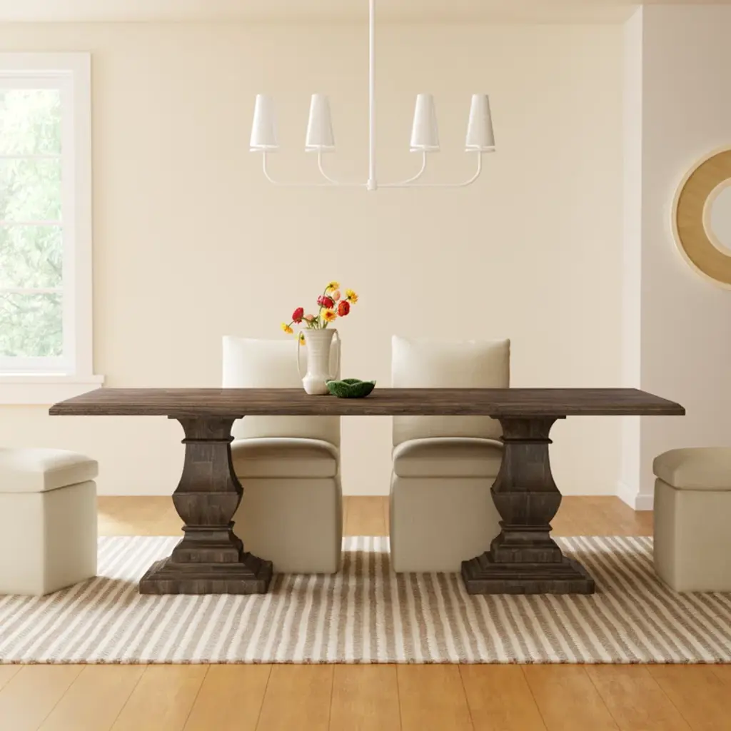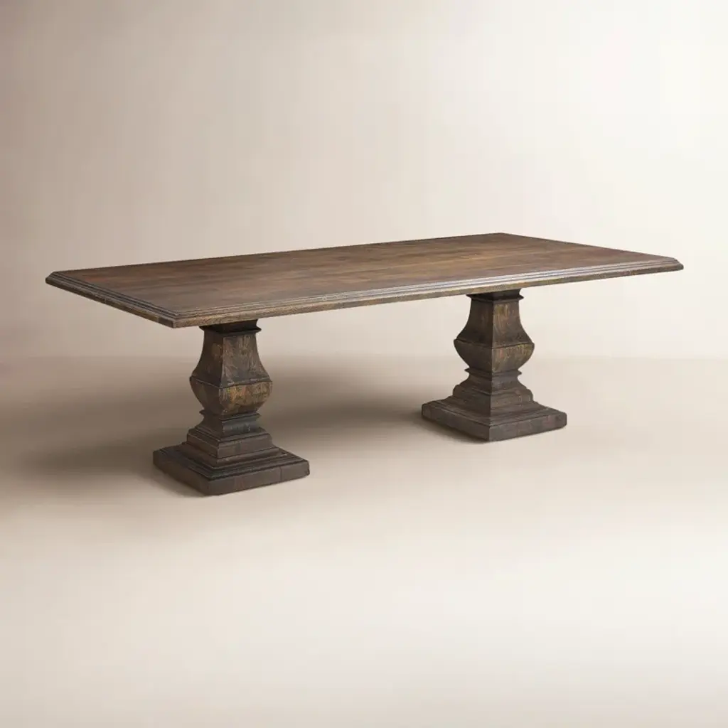 It's all about the details with the beautiful products. Each piece starts with a rich, weathered brown finish over solid mango wood, and features accents like thick multi-layered pedestals and triple-beveled waterfall-edged table tops, resulting in a traditional yet contemporary look. The fine details of this collection truly bring to life an elegance not easily found. This beautiful rectangle dining table with a weathered mango finish pairs perfectly with any solid wood or mixed media dining room decor. The quality construction enhances the durability and beauty of the table, while the presence of natural wood knots and markings bring out the distinct characteristics of this wood, making no two pieces the same.