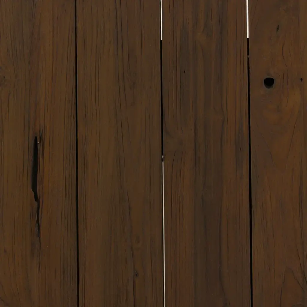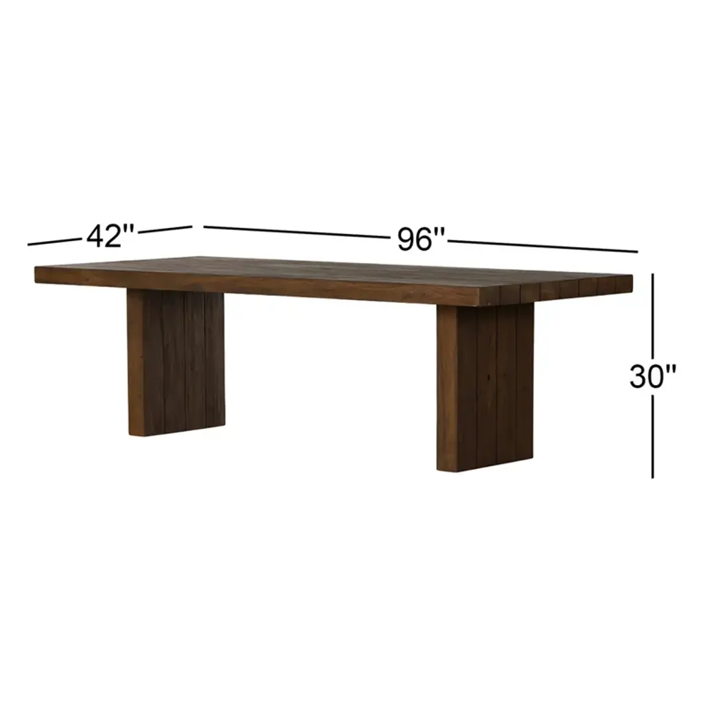 Thick, bold slabs of reclaimed wood and wide slats give this dining table its rich, organic character. A natural-toned heritage brown finish highlights the wood's original knots and grains, making it a great addition to dining outdoors. Cover or store indoors during inclement weather and when not in use.
