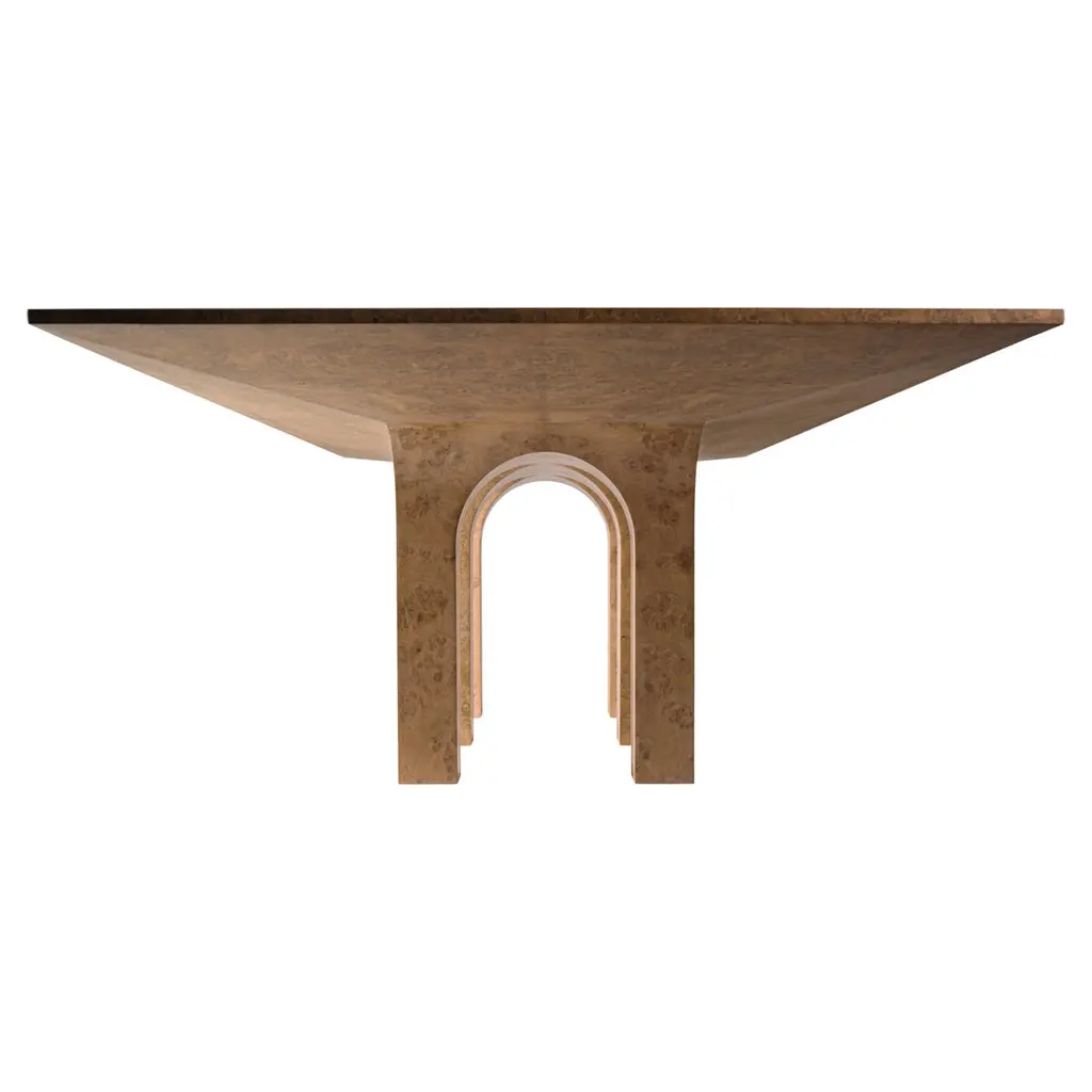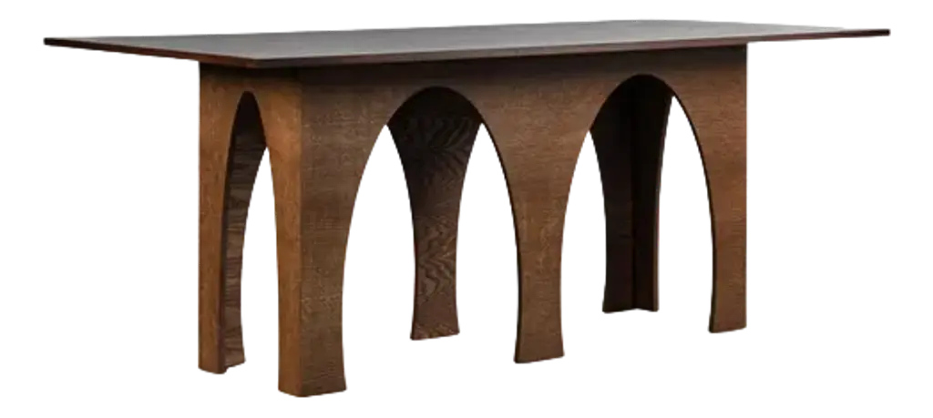 Couture Cork. Cork tabletops—organic, hardworking, surprising—perched on bases made from ebonized and wire brushed oak. Our signature arches motif offers a modern homage to the architecture of the Coliseum and to Oscar Niemeyer's Brasília. Seats up to eight. Flaunt your connoisseurial bona fides with the "It" material of today and beyond—cork—and the quiet and confident forms of our Coliseum tables.