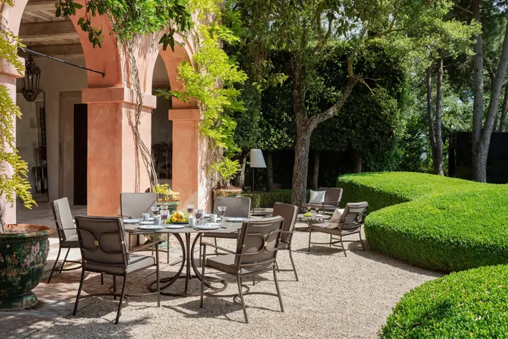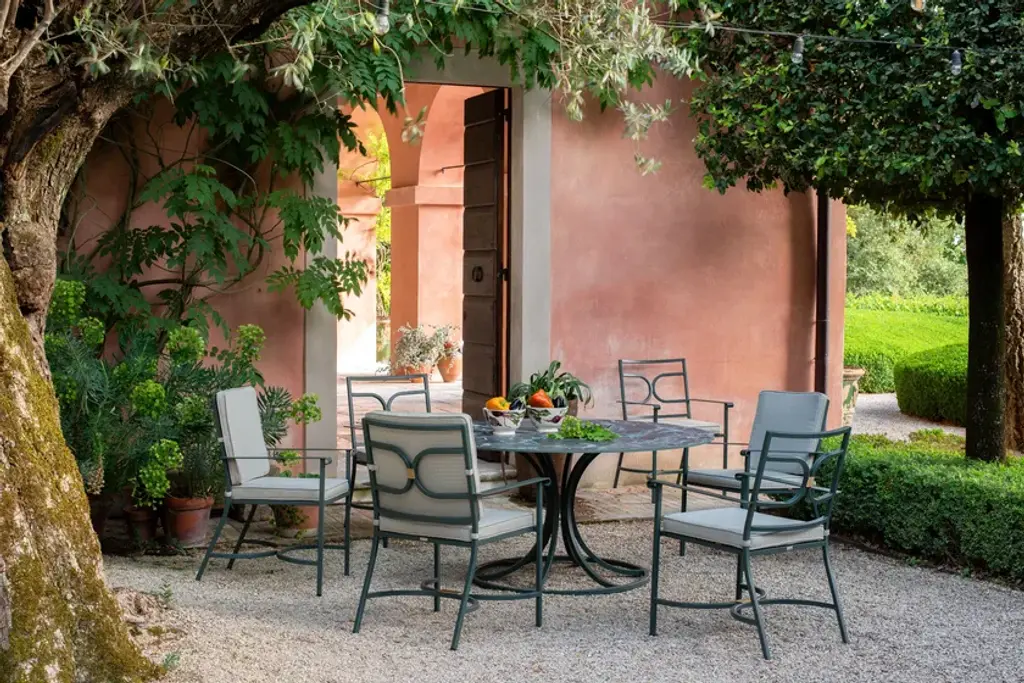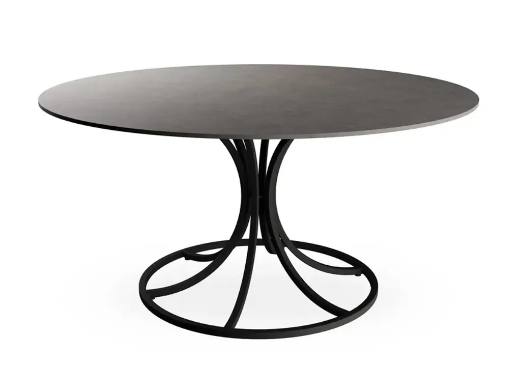 Collier is a round garden table with a porcelain stoneware top for 6/7 seats.Collier, designed by LCM Marin Design Studio, is a classic collection that stands out for its elegance and harmonious forms. The refined details and playful geometric contrasts evoke traditional forms and inspirations, making it an ideal furnishing solution for sophisticated settings, both in hospitality and residential contexts. The family consists of chairs, armchairs, lounge chairs, coffee tables and dining tables with steel or stoneware tops.