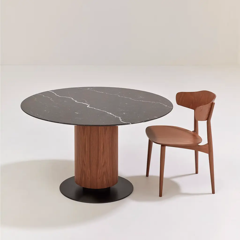 Celebrating the artistry of materials, this table is a testament to timeless craftsmanship. The solid walnut column commands attention with its sturdy yet graceful presence, elegantly lifted by a sleek black metal base. Crowning this masterpiece is a lustrous 120cm diameter Marquinia black marble top, inviting admiration for its striking visual contrast. Ideal for those who appreciate the harmony of form and function, this table promises to be the centerpiece of refined dining experiences.