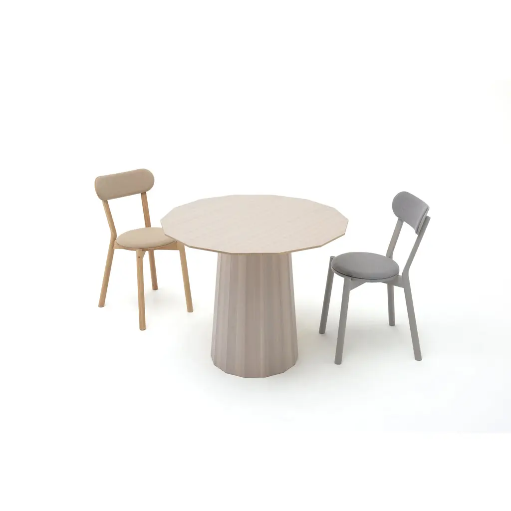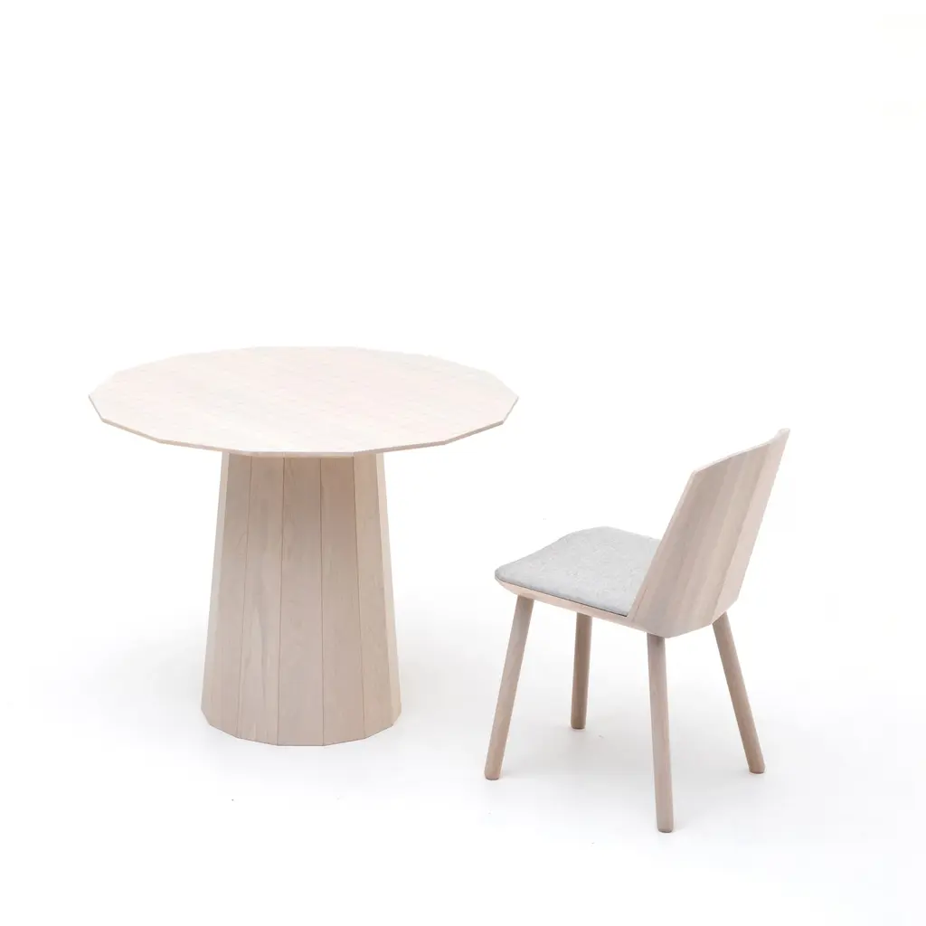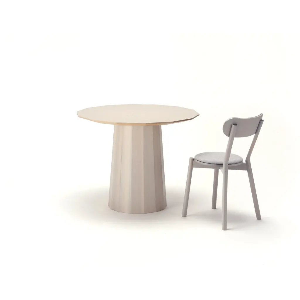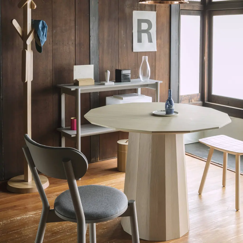 Dine in on this! The Colour Wood Dining Table from Japanese heritage brand Karimoku New Standard expands the multi-hued series from design rock stars Scholten & Baijings. To seat 4-6, this novel 14-sided round table follows similar lines, with the same distinctive barrel-like pedestal made of small-diameter oak wood (long underused and chosen to preserve and revitalize Japanese forests). Two versions illustrate the company's renowned craftsmanship an essential unadorned version in slightly whitened natural wood and a transparent pale grey model with the signature printed dot pattern. Those transparent washes of color and graphic dots infuse traditional craft techniques with contemporary design verve.