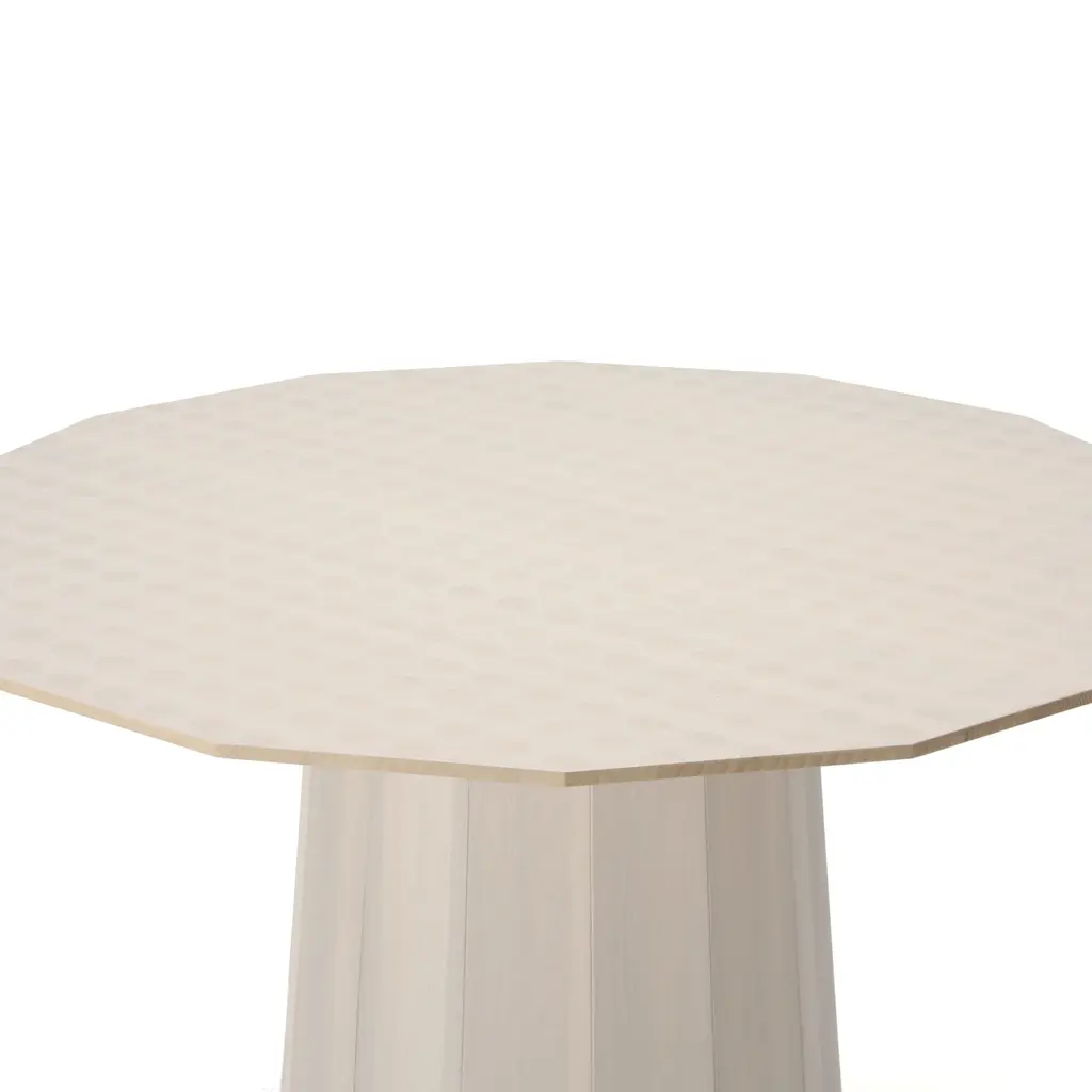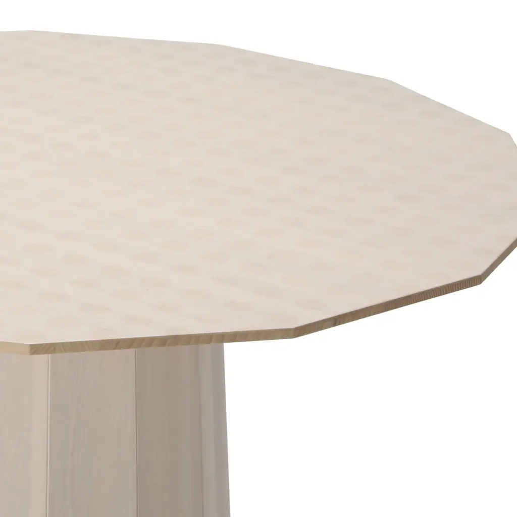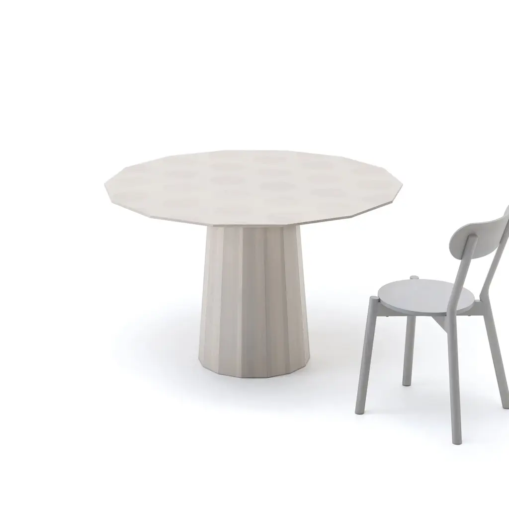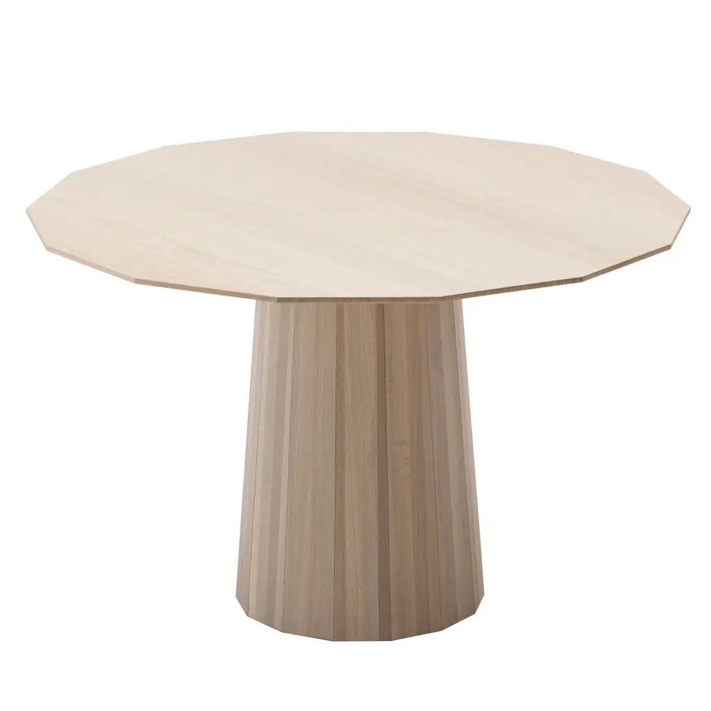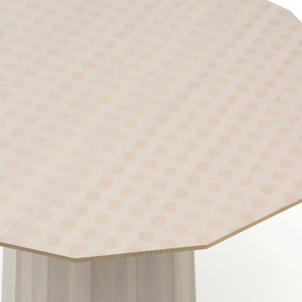 Dine in on this! The Colour Wood Dining Table from Japanese heritage brand Karimoku New Standard expands the multi-hued series from design rock stars Scholten & Baijings. To seat 4-6, this novel 14-sided round table follows similar lines, with the same distinctive barrel-like pedestal made of small-diameter oak wood (long underused and chosen to preserve and revitalize Japanese forests). Two versions illustrate the company's renowned craftsmanship an essential unadorned version in slightly whitened natural wood and a transparent pale grey model with the signature printed dot pattern. Those transparent washes of color and graphic dots infuse traditional craft techniques with contemporary design verve.