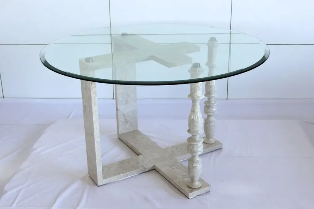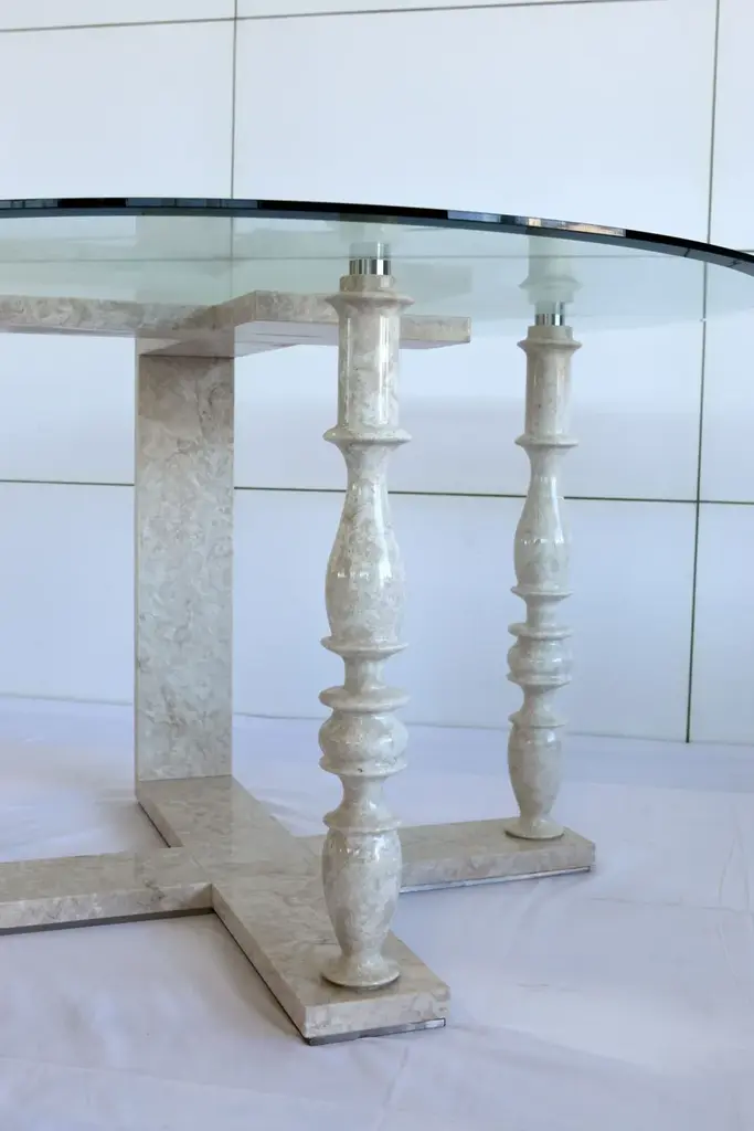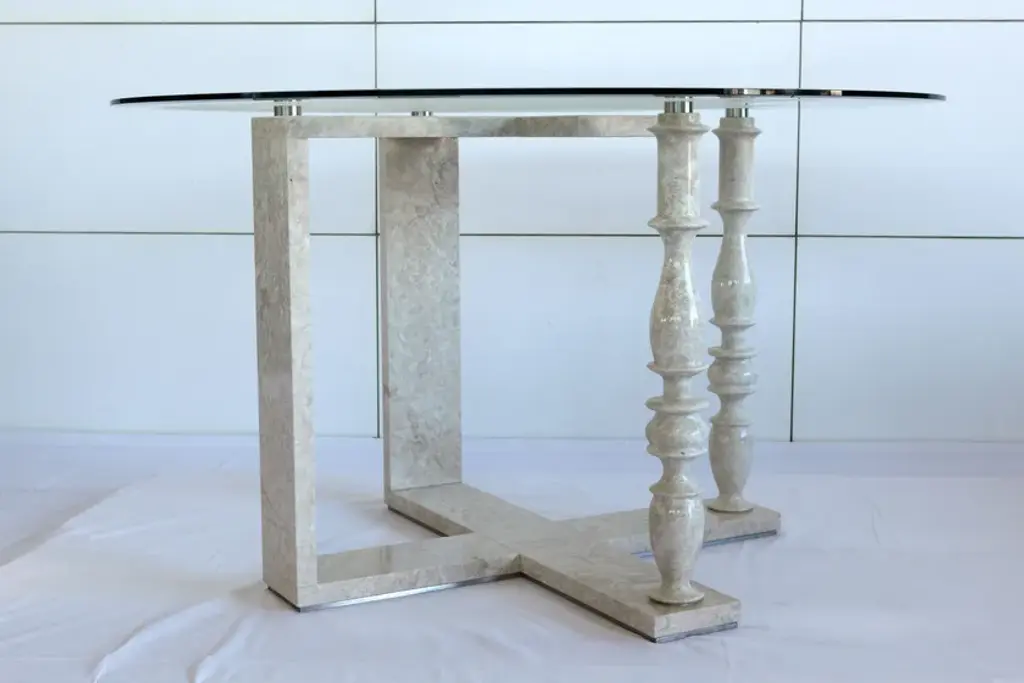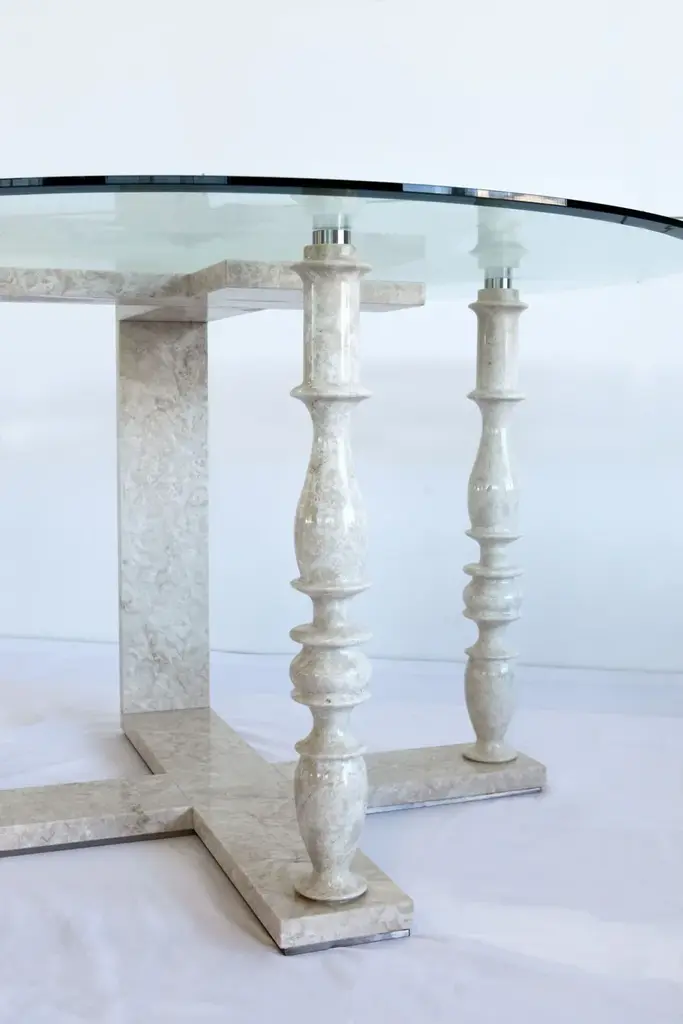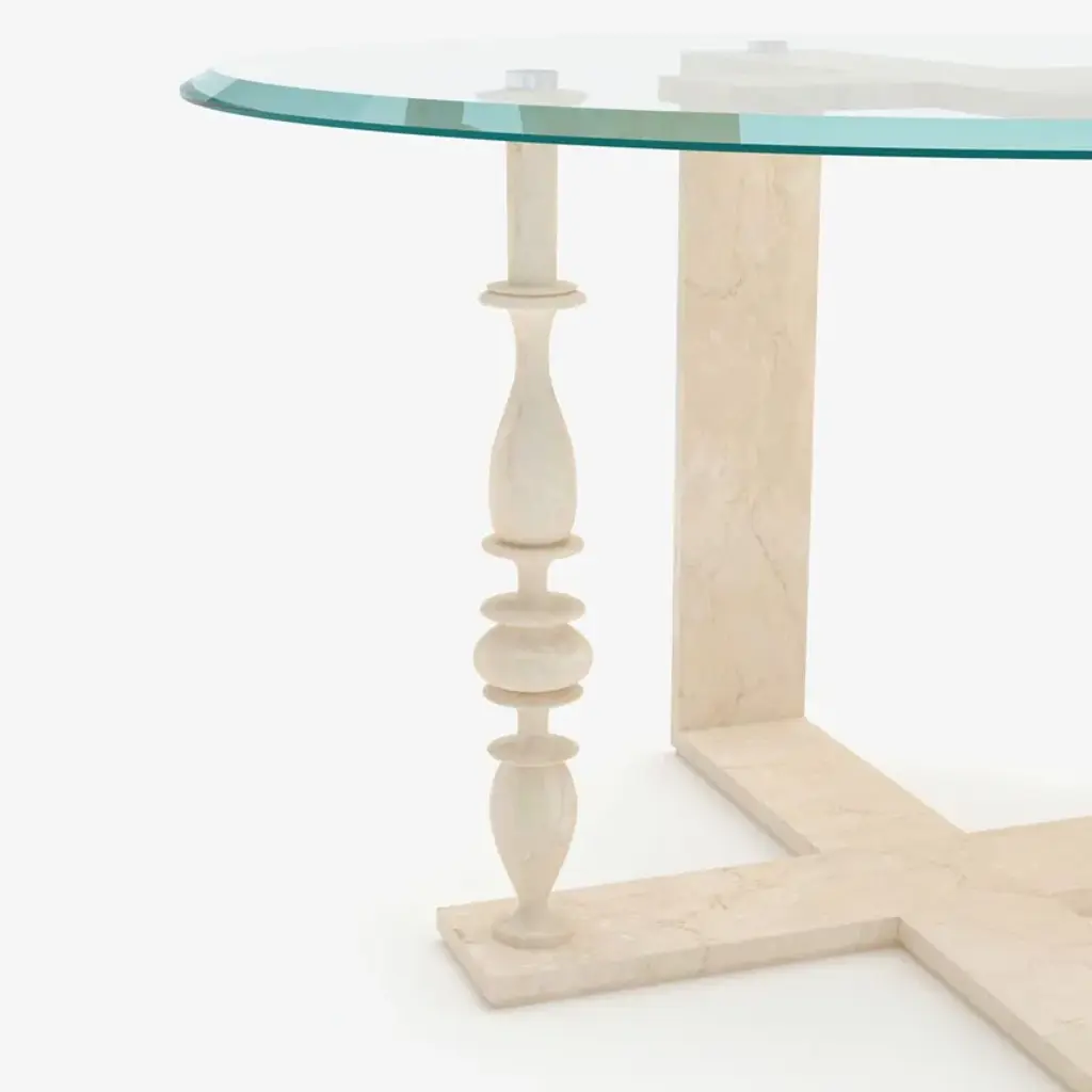 The main feature of the Columns Frame table is the table legs, made entirely of marble, which echo the shape of a column and thus delineate a classic style. The two opposite legs, simple and linear, create a sharp contrast and make the table adaptable to all kinds of environments. The glass top allows us to appreciate the unusual shape of the four legs, joined together only in the base. Created in collaboration with architect and designer Luca Scacchetti, this marble table with a round shape is part of a collection composed of three dining tables, different from each other by the shape of the two columns. Variations in color or slight imperfections are the result of the craftsmanship of this article and are not to be considered defects.