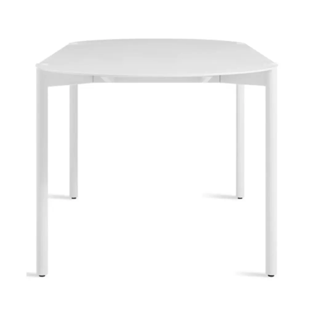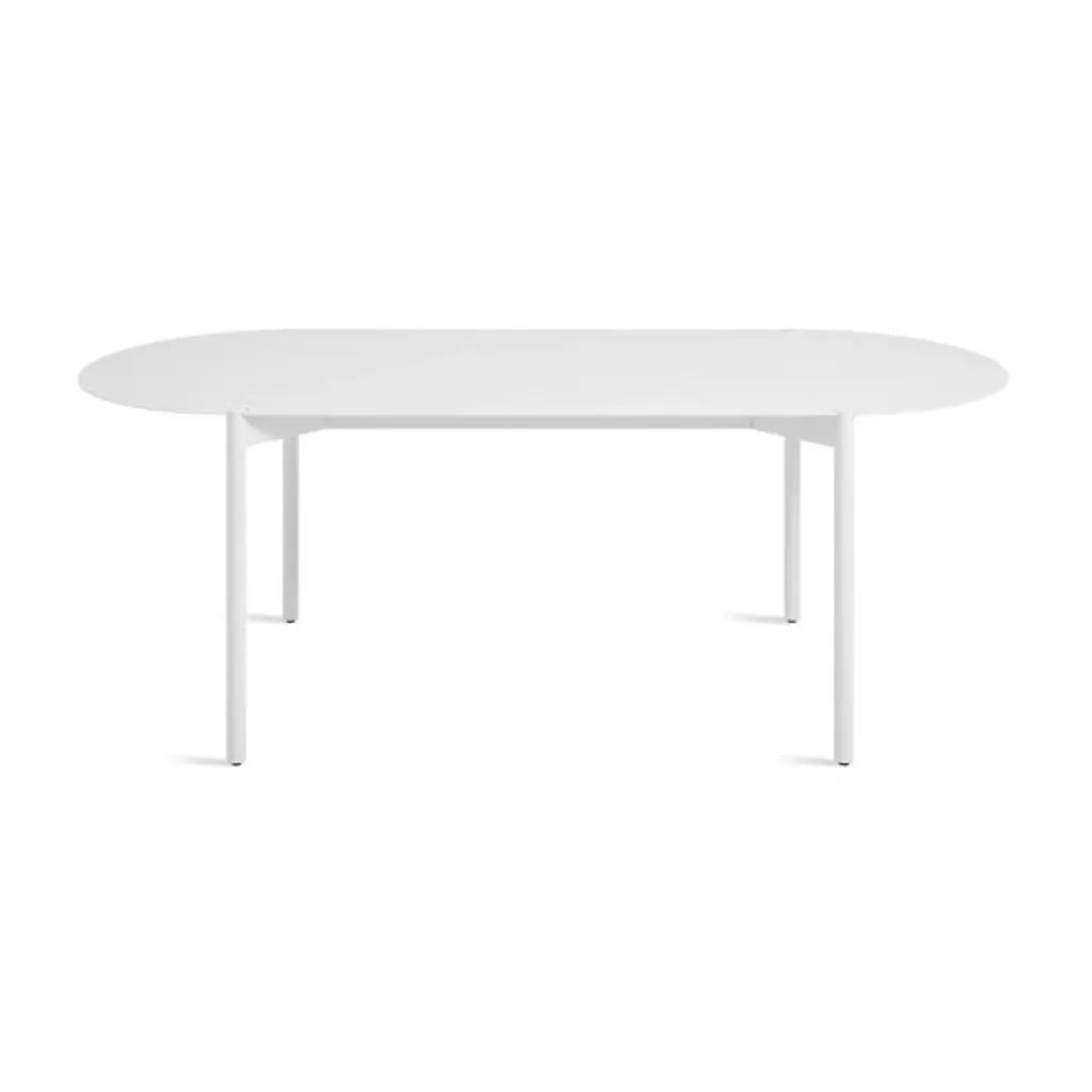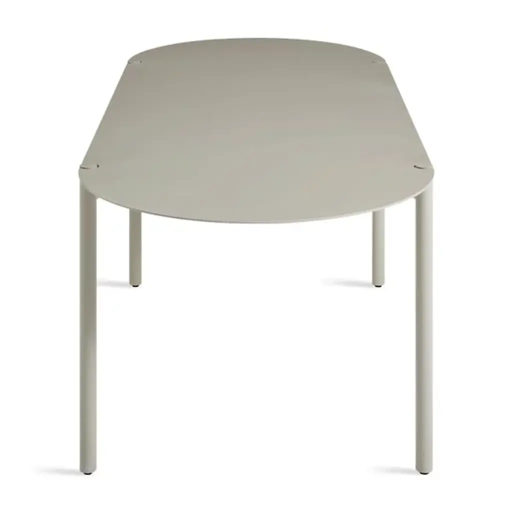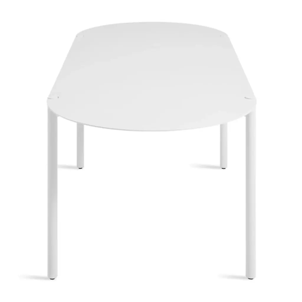 Enjoy a well-earned meal while inside or outside, seated in front of the Comeuppance Capsule Shape Dining Table from Blu Dot. This piece creates clean outlines that speak to the modern or contemporary aesthetic. A powder-coated aluminum construction makes the table perfect in the dining room or covered patio. It gets its airy personality from a set of slim legs. The straight edges of the legs complement the generous curves of the capsule-shaped tabletop. While roomy, the tabletop makes a great first impression through its ultra-slim construction.