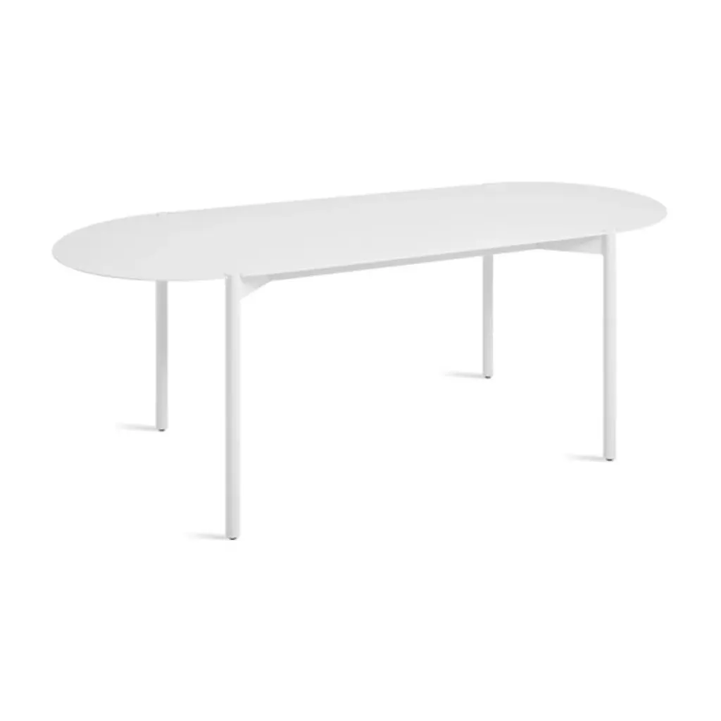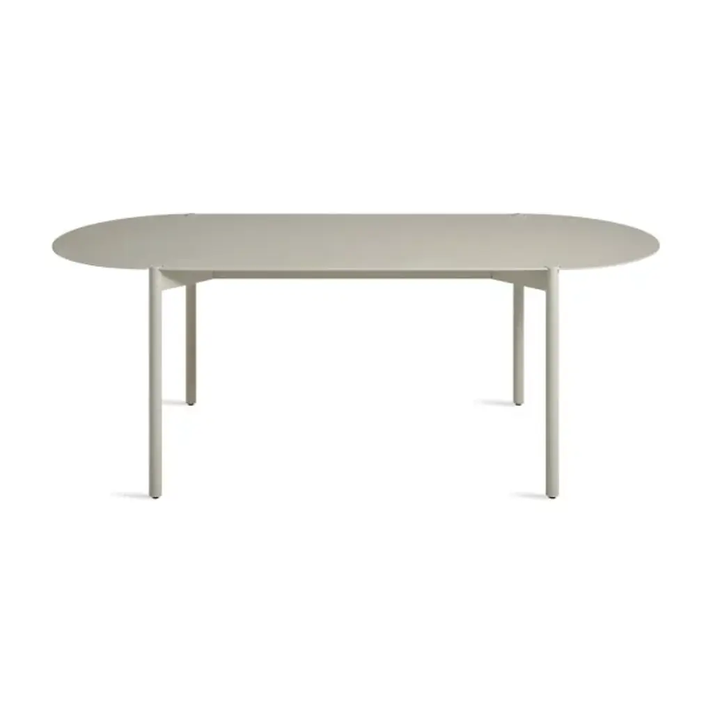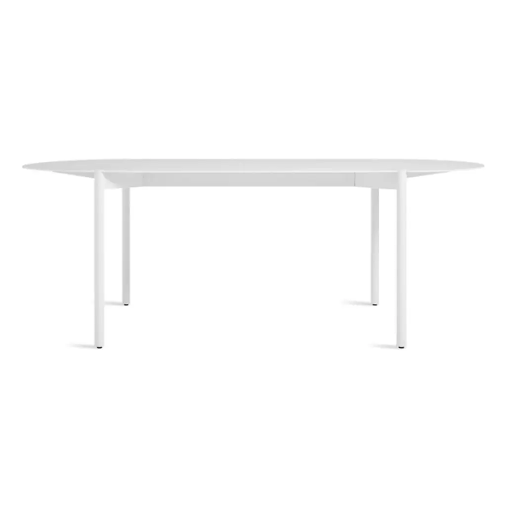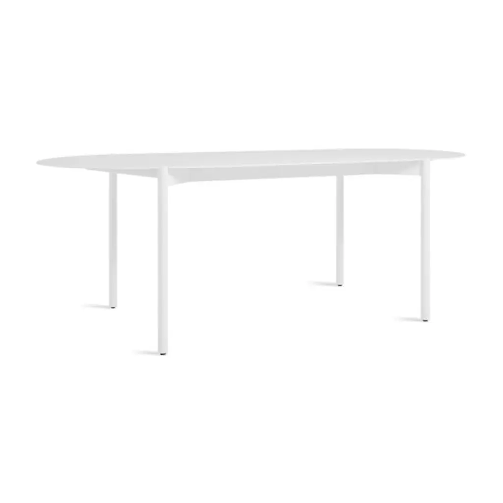 Enjoy a well-earned meal while inside or outside, seated in front of the Comeuppance Capsule Shape Dining Table from Blu Dot. This piece creates clean outlines that speak to the modern or contemporary aesthetic. A powder-coated aluminum construction makes the table perfect in the dining room or covered patio. It gets its airy personality from a set of slim legs. The straight edges of the legs complement the generous curves of the capsule-shaped tabletop. While roomy, the tabletop makes a great first impression through its ultra-slim construction.