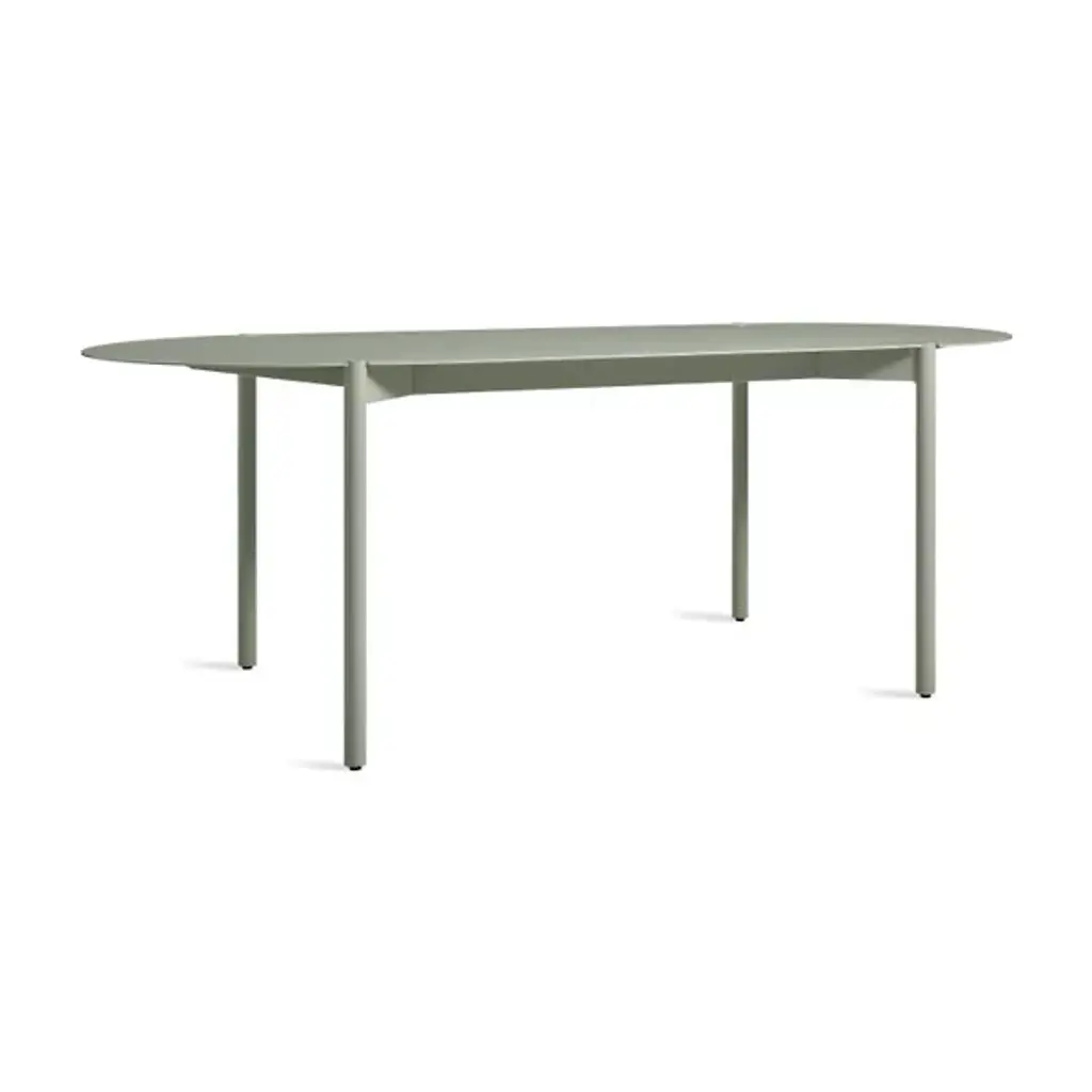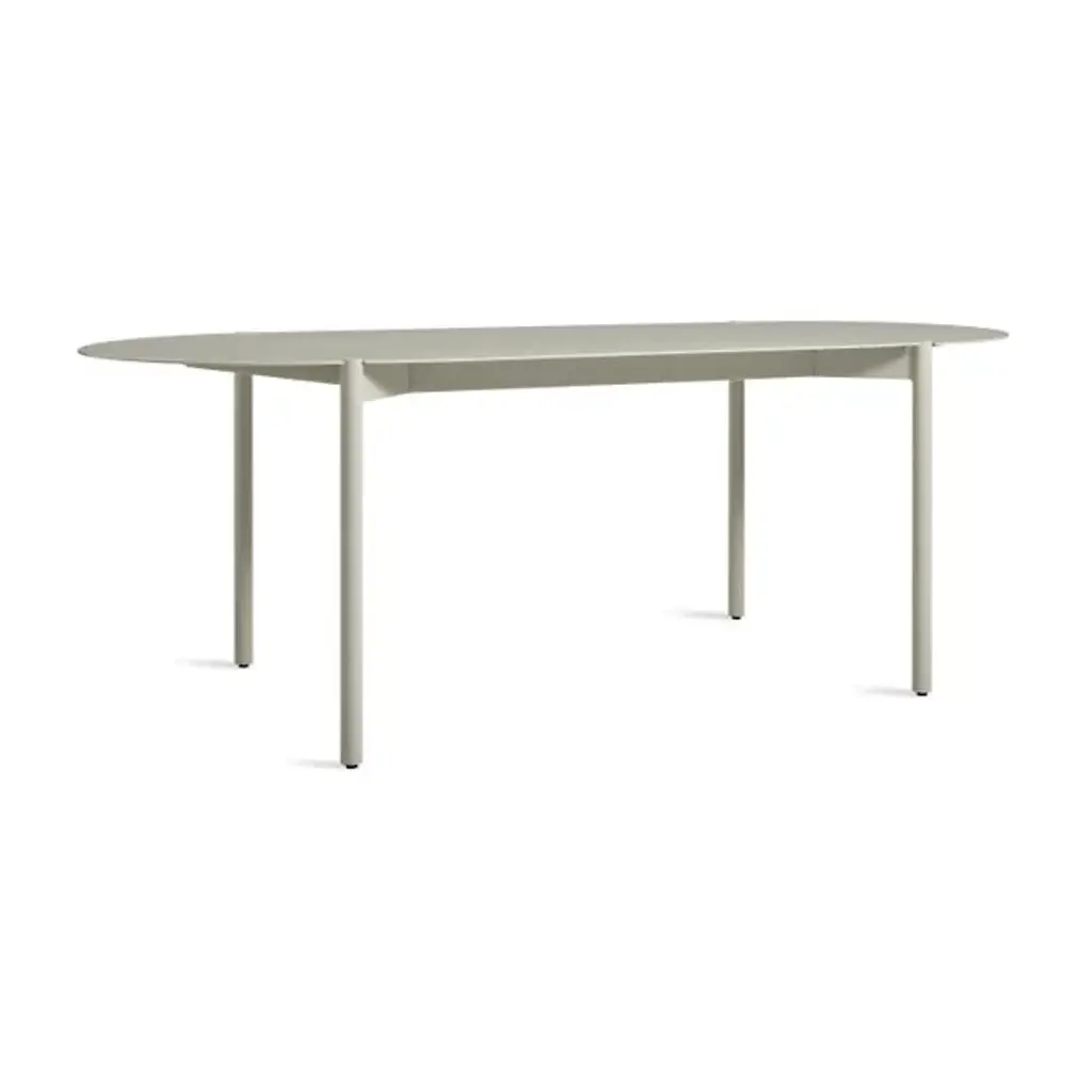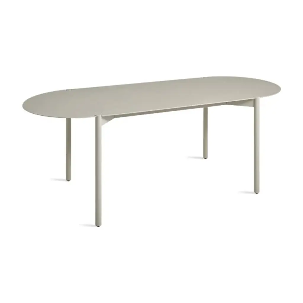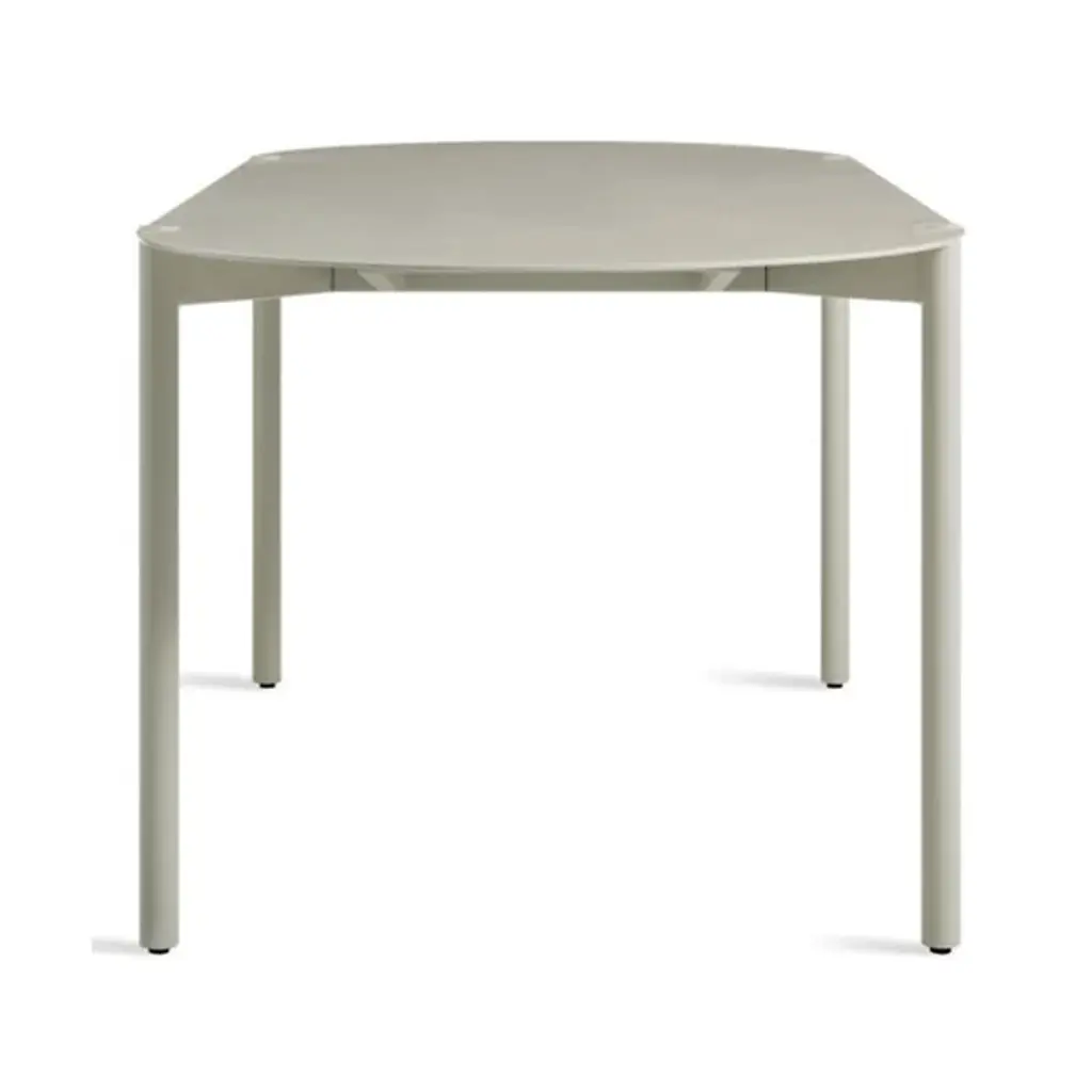 Enjoy a well-earned meal while inside or outside, seated in front of the Comeuppance Capsule Shape Dining Table from Blu Dot. This piece creates clean outlines that speak to the modern or contemporary aesthetic. A powder-coated aluminum construction makes the table perfect in the dining room or covered patio. It gets its airy personality from a set of slim legs. The straight edges of the legs complement the generous curves of the capsule-shaped tabletop. While roomy, the tabletop makes a great first impression through its ultra-slim construction.