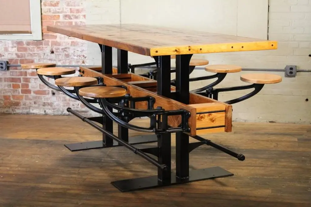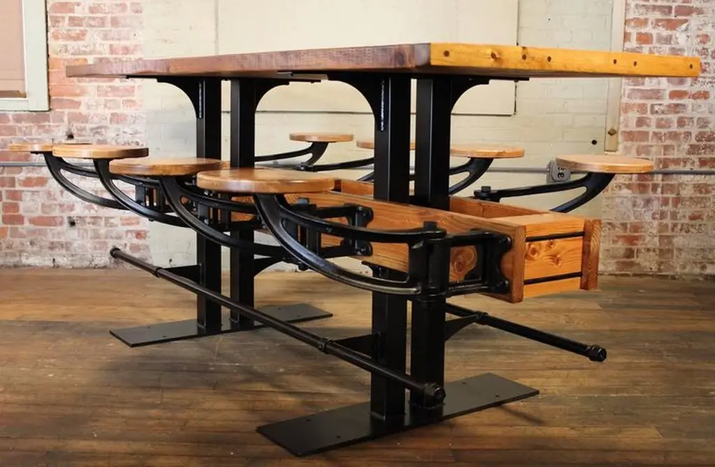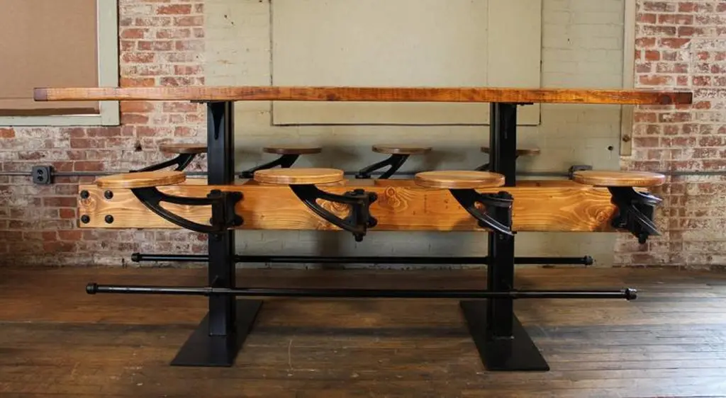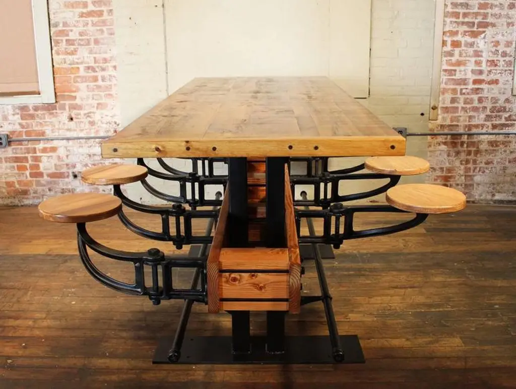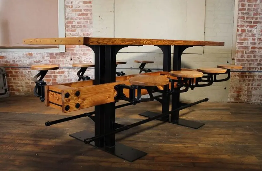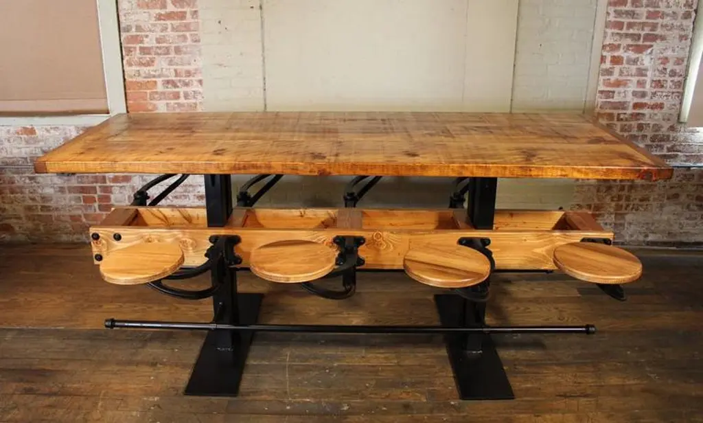 Swing out seat restaurant bar / pub height table. Made from wood, cast iron and steel. Featuring eight cast iron and wood swing out seats, foot rails and 2" thick rough sawn pine top. Custom sizes and materials available. Quantity and designer discounts available.