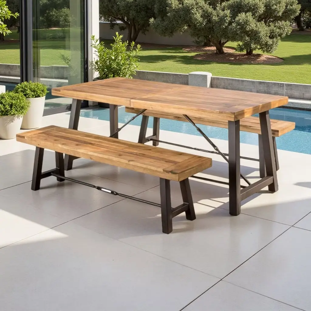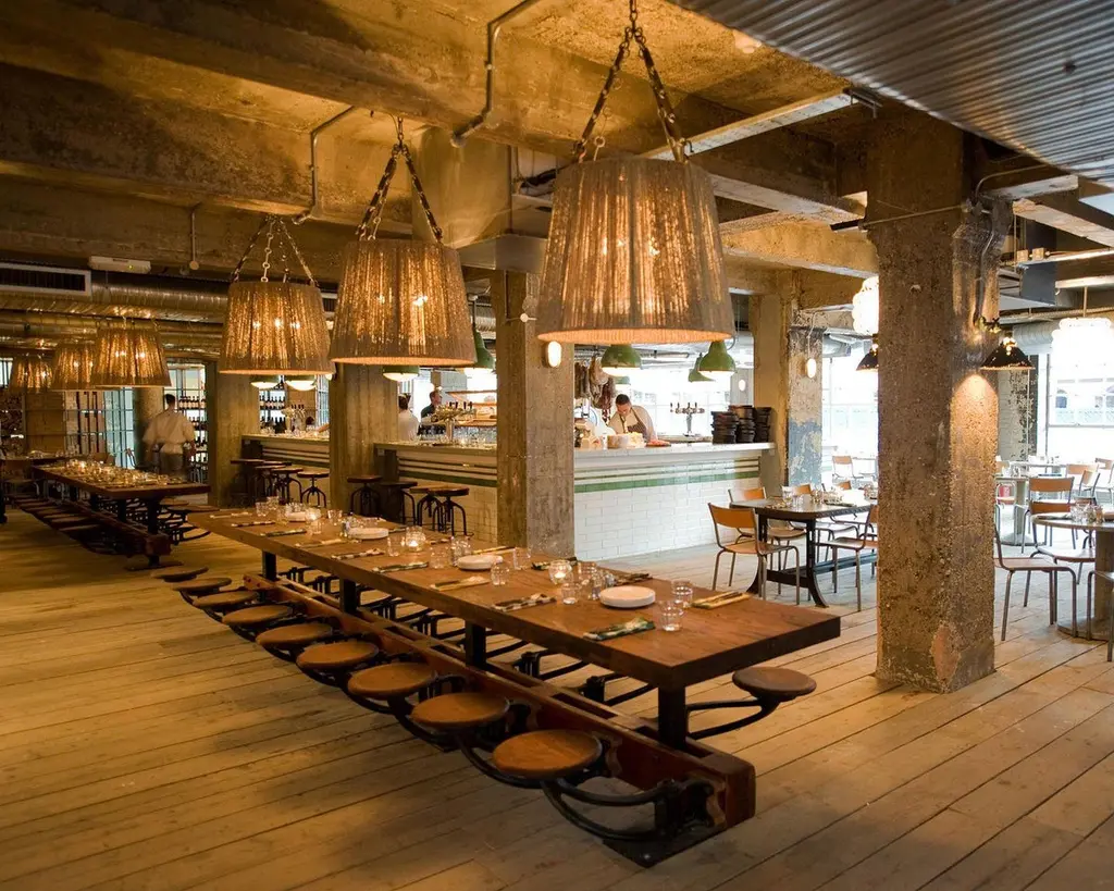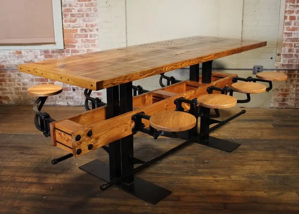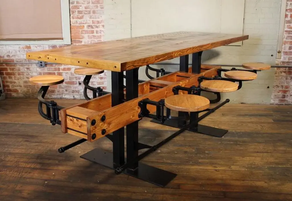 Swing out seat restaurant bar / pub height table. Made from wood, cast iron and steel. Featuring eight cast iron and wood swing out seats, foot rails and 2" thick rough sawn pine top. Custom sizes and materials available. Quantity and designer discounts available.