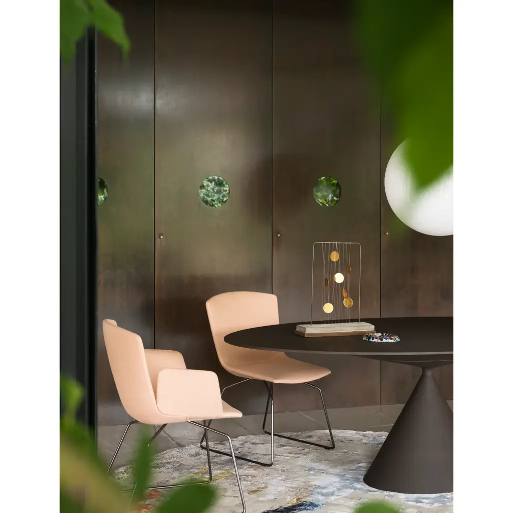 Introducing Clay, a table-sculpture that balances minimalism and artistry. Its geometric volumes create a luxurious product, available in oval shape with a hand-spread materic finish and various top options. Experience the bold support of the reduced polyurethane base, perfect for indoor or outdoor use. Elevate your space with the optional "Lazy Susan" centerpiece.