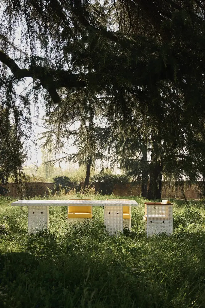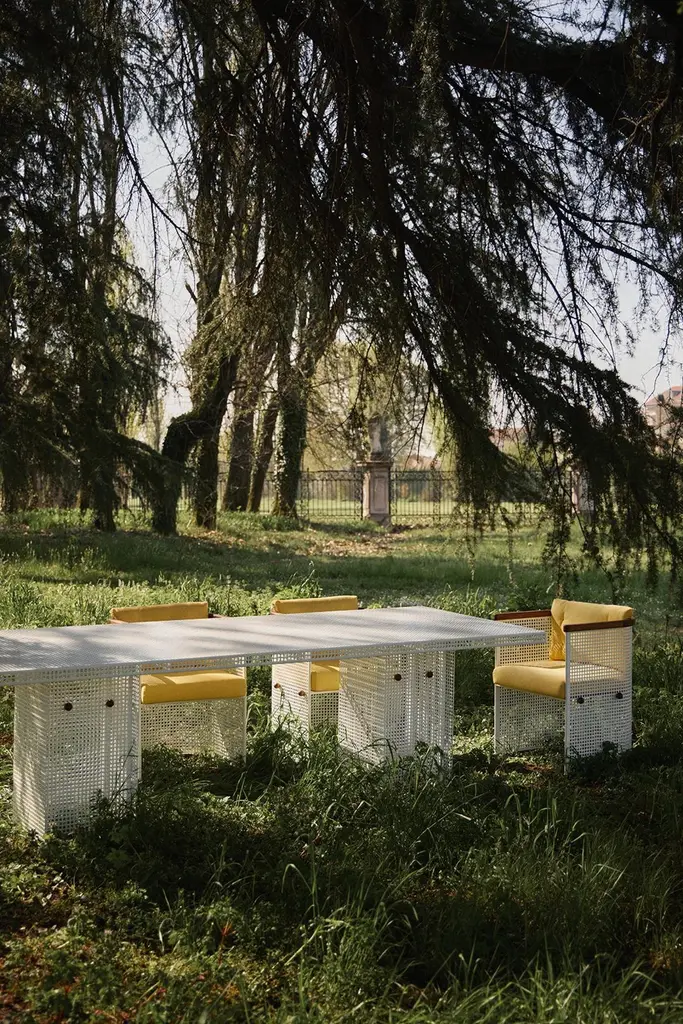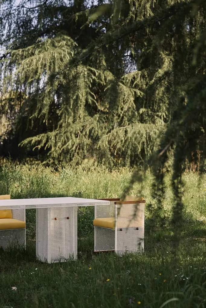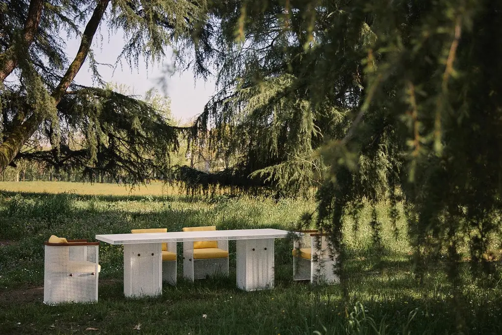 The Conservatory Collection offers a window to a bygone era, when conservatories and orangeries were sanctuaries of peace and quiet, seamlessly blending the indoors with the natural world. These spaces, often surrounded by lush greenery, provided a much-needed respite from the bustle of daily life, acting as tranquil havens for reflection and restoration. Historically, nature has been a powerful force for healing, and the Conservatory Collection draws on this timeless connection. At the heart of the design are the thousands of delicate perforations, a nod to Josef Hoffmann’s iconic vase and bowl collection from 1905. These intricate openings in steel allow the natural world to flow through the furniture, uninterrupted. The perforations invite light and air to pass through, preserving the integrity of the surroundings while subtly integrating the furniture into the outdoor environment. The result is a refined balance between the material and the organic, where nature and design coexist in perfect harmony.Designed by Yaniv Chen