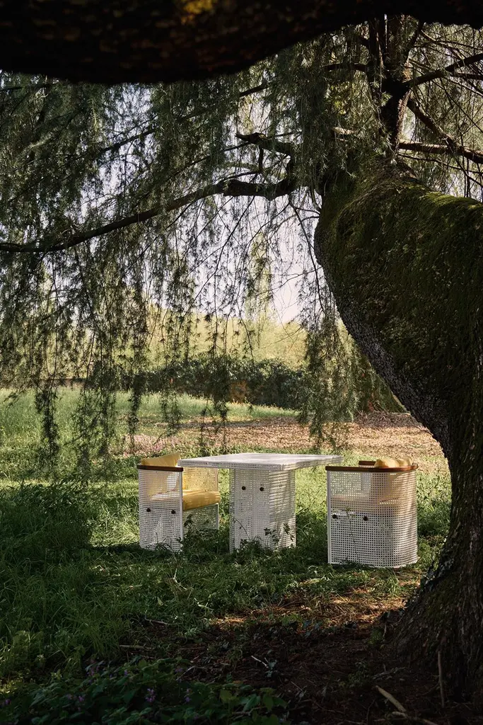The Conservatory Collection offers a window to a bygone era, when conservatories and orangeries were sanctuaries of peace and quiet, seamlessly blending the indoors with the natural world. These spaces, often surrounded by lush greenery, provided a much-needed respite from the bustle of daily life, acting as tranquil havens for reflection and restoration. Historically, nature has been a powerful force for healing, and the Conservatory Collection draws on this timeless connection. At the heart of the design are the thousands of delicate perforations, a nod to Josef Hoffmann’s iconic vase and bowl collection from 1905. These intricate openings in steel allow the natural world to flow through the furniture, uninterrupted. The perforations invite light and air to pass through, preserving the integrity of the surroundings while subtly integrating the furniture into the outdoor environment. The result is a refined balance between the material and the organic, where nature and design coexist in perfect harmony.Designed by Yaniv Chen