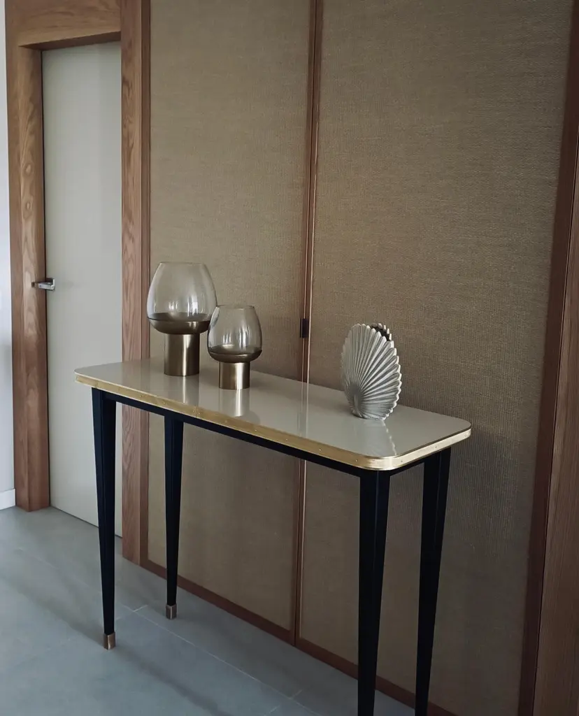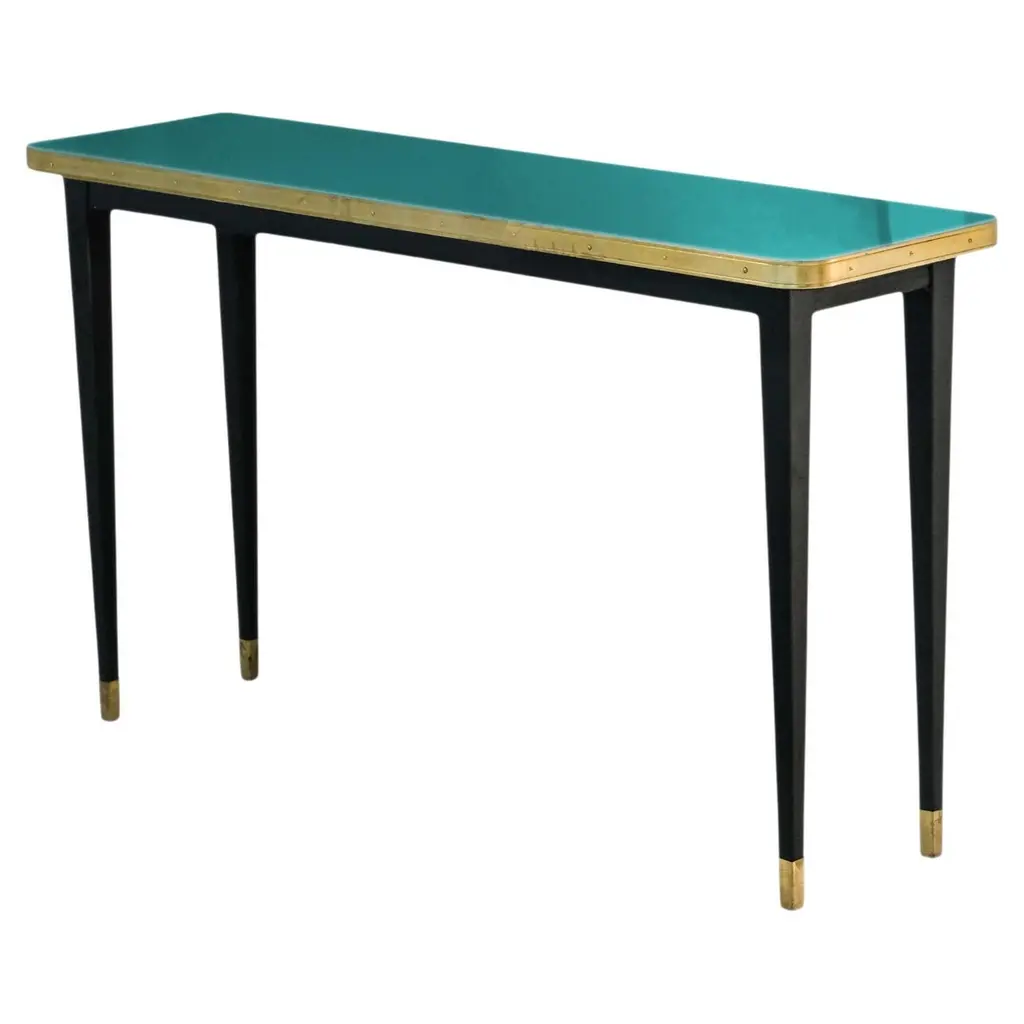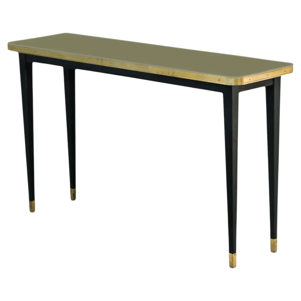 Julieta Collection. Console Table with High Gloss Top, Brass Tape Framed, Black Powder Coating Conical Legs with Brass EndIntroducing the stunning console table with black powder-coated steel construction, boasting sleek conical legs with brass accents at the bottom. The table top features a high gloss laminate finish, available in a variety of colors to suit your taste and style. The Mid-Century Modern influence is evident in the brass tape frame that adds a touch of sophistication and elegance.This exquisite table is perfect for various settings, including hospitality venues such as hotels, restaurants, and bars, as well as offices or private residences. Designed and fully manufactured in Spain, each piece is meticulously crafted to order, ensuring exceptional quality and attention to detail.The conical legs not only provide stability but also add a touch of contemporary flair, making this dining room table a statement piece in any space. The black powder coating on the steel gives it a sleek and modern look that complements the overall design. The brass accents on the legs add a touch of opulence, elevating the table's aesthetic appeal.The table top is made from high gloss laminate, which not only adds durability but also gives it a lustrous finish that catches the eye. The multiple color options for the table top allow you to choose the perfect hue to match your interior decor. The brass tape frame adds a touch of timeless elegance and serves as a visual highlight that sets this table apart.With its unique blend of Mid-Century Modern style, meticulous craftsmanship, and versatility, this dining room table is a true masterpiece that exudes sophistication and style. Whether it's for entertaining guests in a chic restaurant or adding a touch of elegance to your private residence, this table is sure to make a statement in any setting. Don't hesitate to inquire about specific dimensions, as each piece is made to order, ensuring a perfect fit for your space. Elevate your dining experience with this exceptional dining room table with conical legs, designed to impress and built to last.