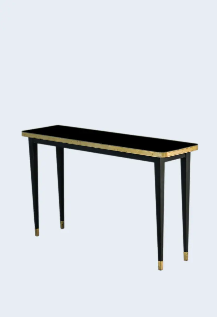 Julieta Collection. Console Table with High Gloss Top, Brass Tape Framed, Black Powder Coating Conical Legs with Brass EndIntroducing the stunning console table with black powder-coated steel construction, boasting sleek conical legs with brass accents at the bottom. The table top features a high gloss laminate finish, available in a variety of colors to suit your taste and style. The Mid-Century Modern influence is evident in the brass tape frame that adds a touch of sophistication and elegance.This exquisite table is perfect for various settings, including hospitality venues such as hotels, restaurants, and bars, as well as offices or private residences. Designed and fully manufactured in Spain, each piece is meticulously crafted to order, ensuring exceptional quality and attention to detail.The conical legs not only provide stability but also add a touch of contemporary flair, making this dining room table a statement piece in any space. The black powder coating on the steel gives it a sleek and modern look that complements the overall design. The brass accents on the legs add a touch of opulence, elevating the table's aesthetic appeal.The table top is made from high gloss laminate, which not only adds durability but also gives it a lustrous finish that catches the eye. The multiple color options for the table top allow you to choose the perfect hue to match your interior decor. The brass tape frame adds a touch of timeless elegance and serves as a visual highlight that sets this table apart.With its unique blend of Mid-Century Modern style, meticulous craftsmanship, and versatility, this dining room table is a true masterpiece that exudes sophistication and style. Whether it's for entertaining guests in a chic restaurant or adding a touch of elegance to your private residence, this table is sure to make a statement in any setting. Don't hesitate to inquire about specific dimensions, as each piece is made to order, ensuring a perfect fit for your space. Elevate your dining experience with this exceptional dining room table with conical legs, designed to impress and built to last.