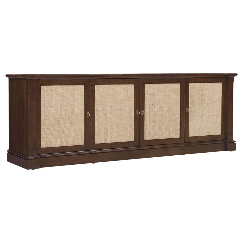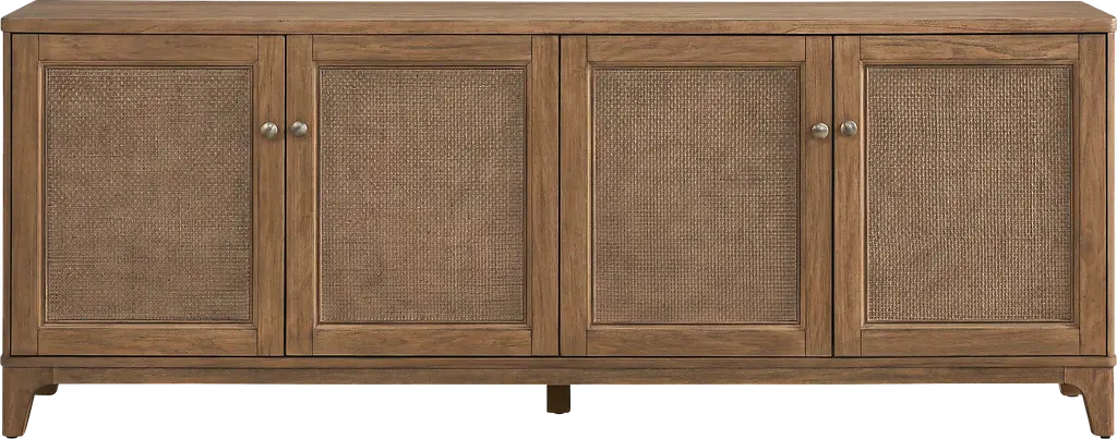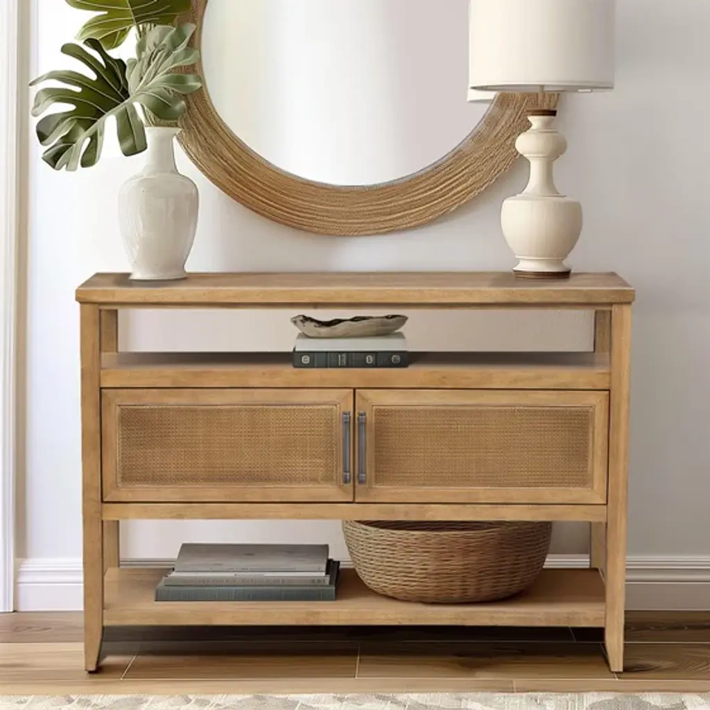 Enhance your space with this console table featuring two natural cane doors for a touch of texture and style. Designed with ample storage, it includes fixed shelving and concealed compartments to keep your essentials organized. Crafted from wood in a warm toasted almond finish, it blends transitional, casual, and contemporary aesthetics. Versatile in design, it fits seamlessly in living rooms, dining rooms, or entryways. Adjustable levelers ensure stability on uneven surfaces, making it a practical and stylish addition to any home.