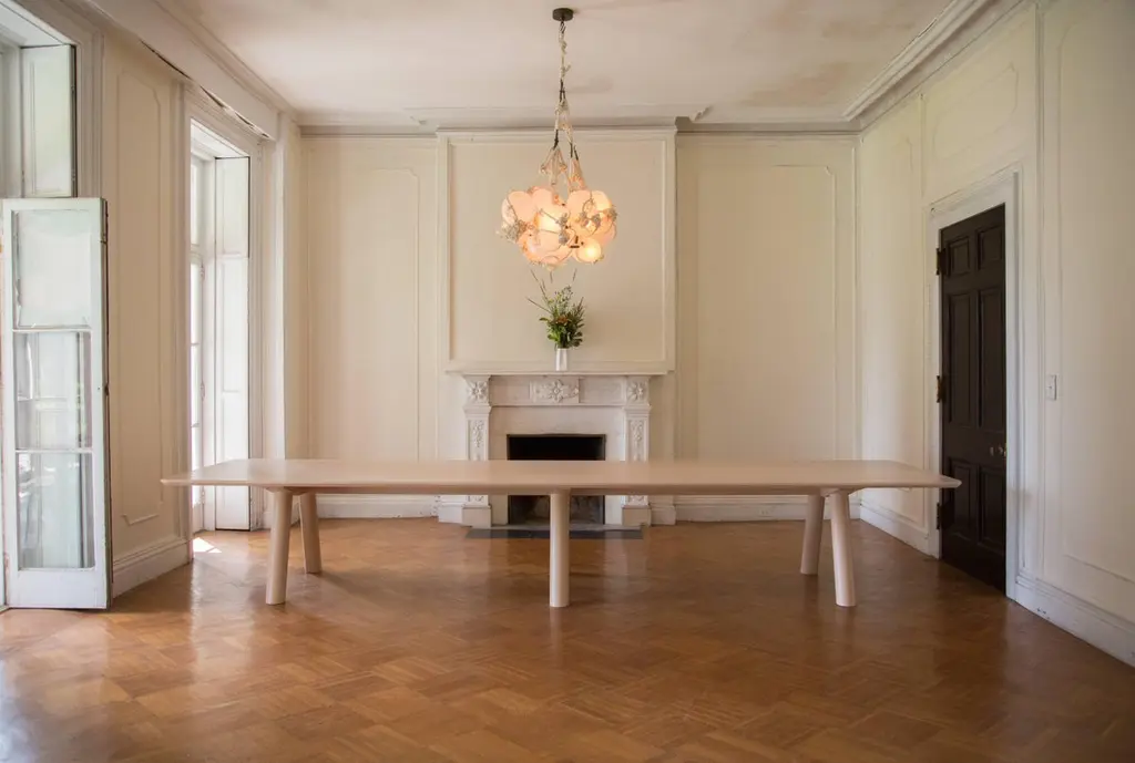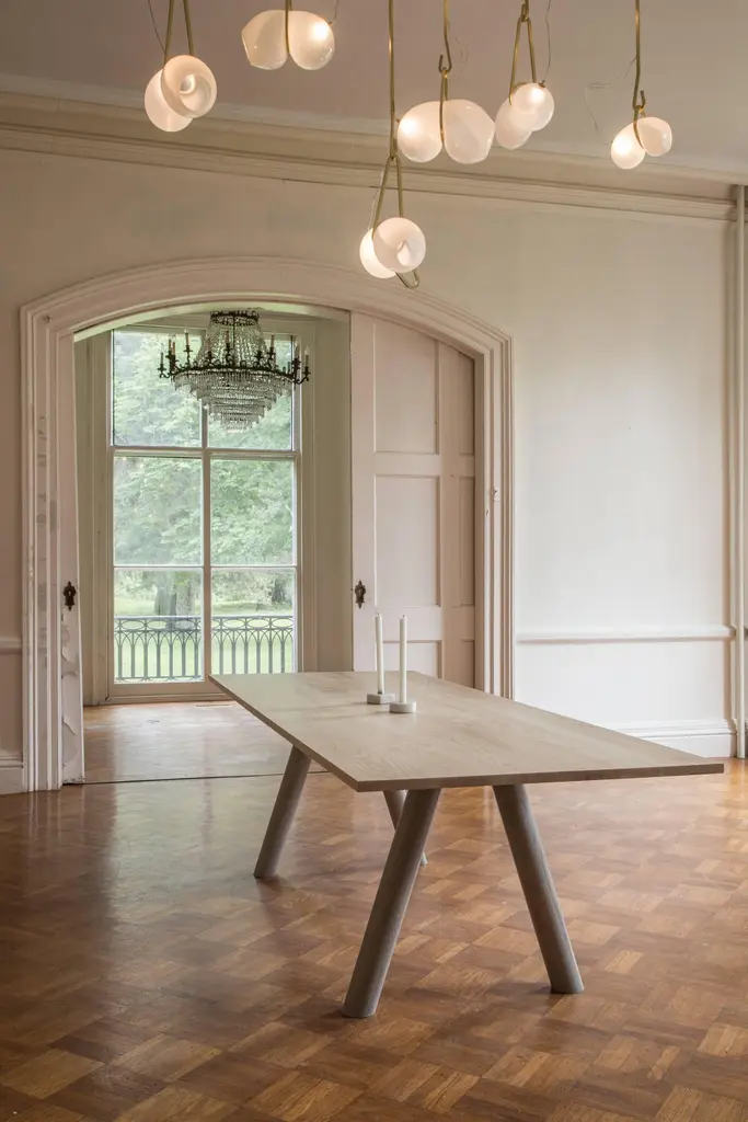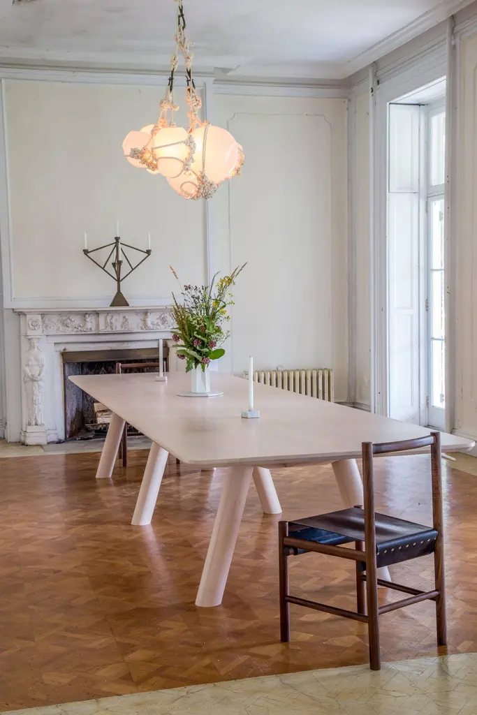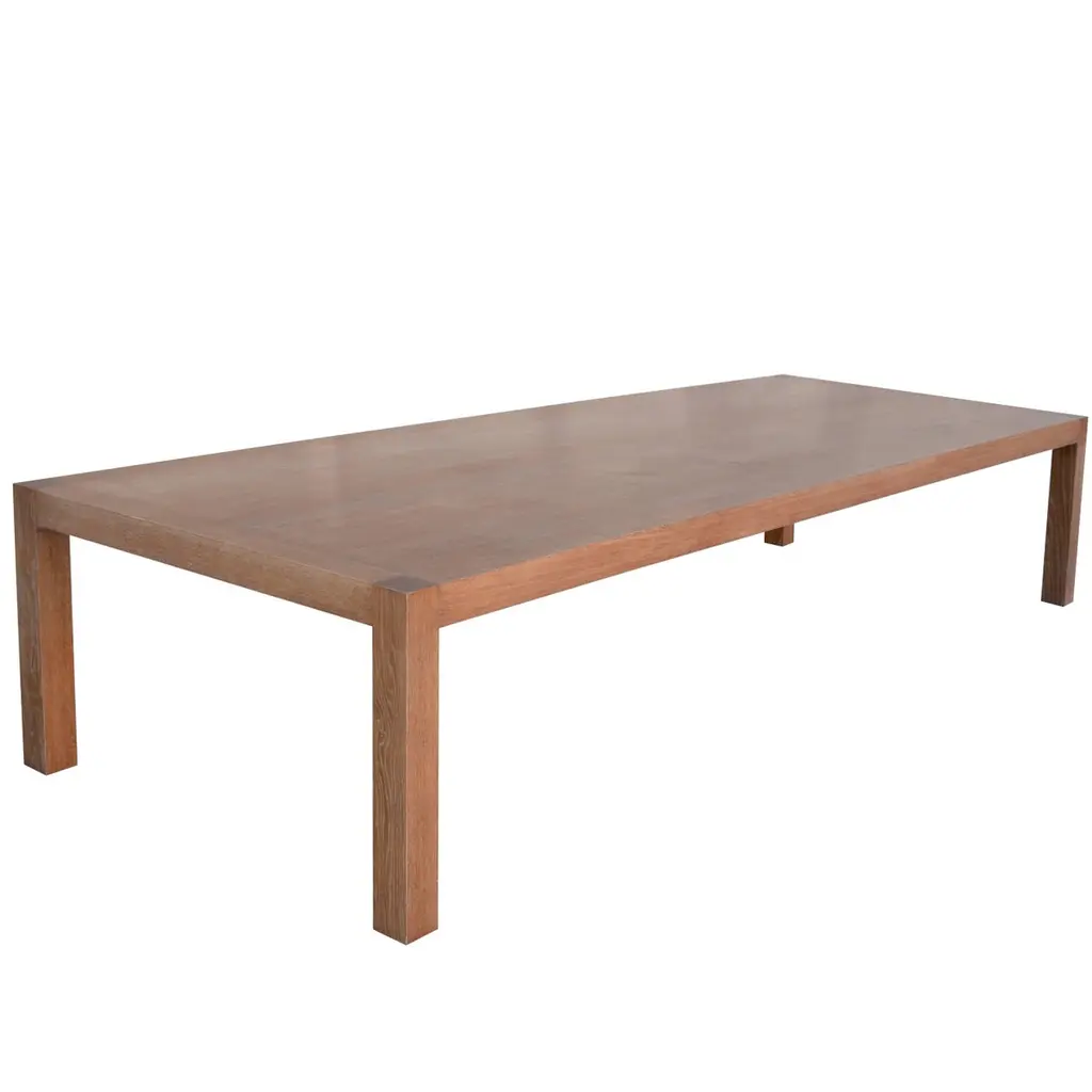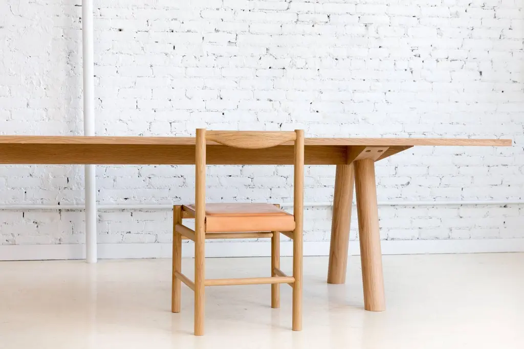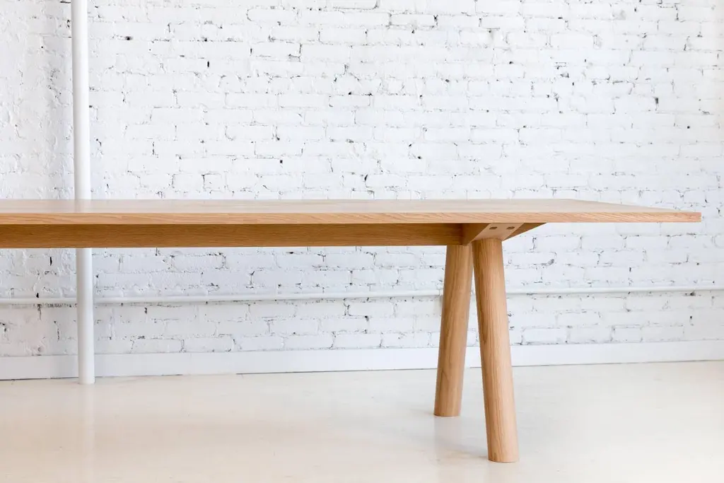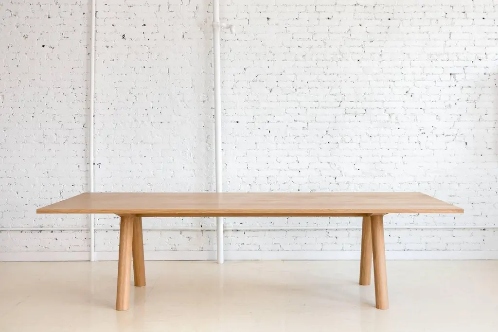 This contemporary, minimal dining table features large diameter legs and a bold trestle that give rise to an elegant hardwood top. Top includes rounded corners with an optional underside bevel to compliment details found on the base.Made to order in custom sizes, shapes and finishes. Shown here in walnut with a hand rubbed oil finish and white oak and hard maple in a water-based durable finish. Also available in ash. Pricing dependent on variations.Table pictured with our Range Chairs.
