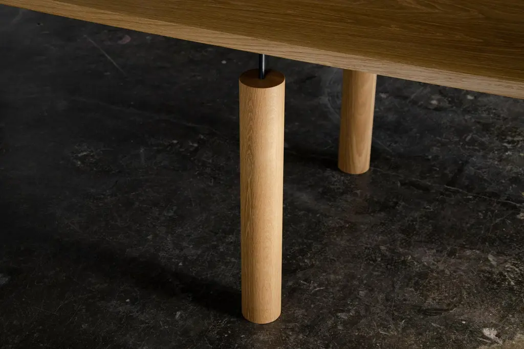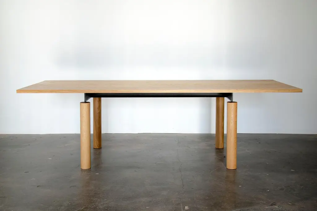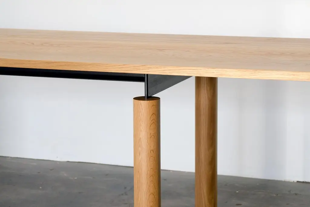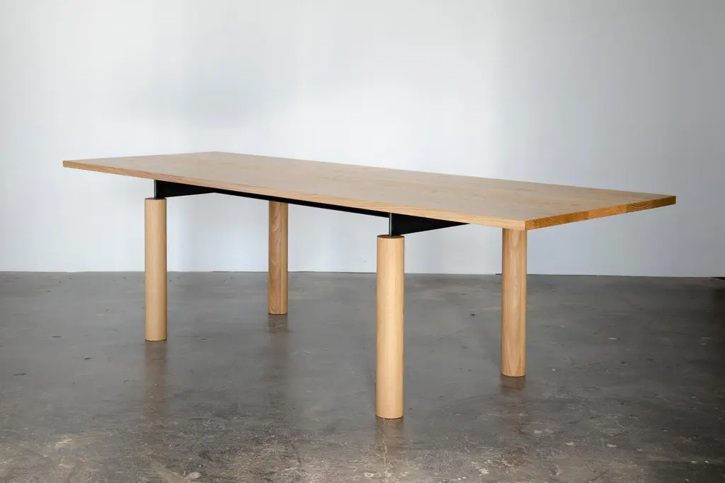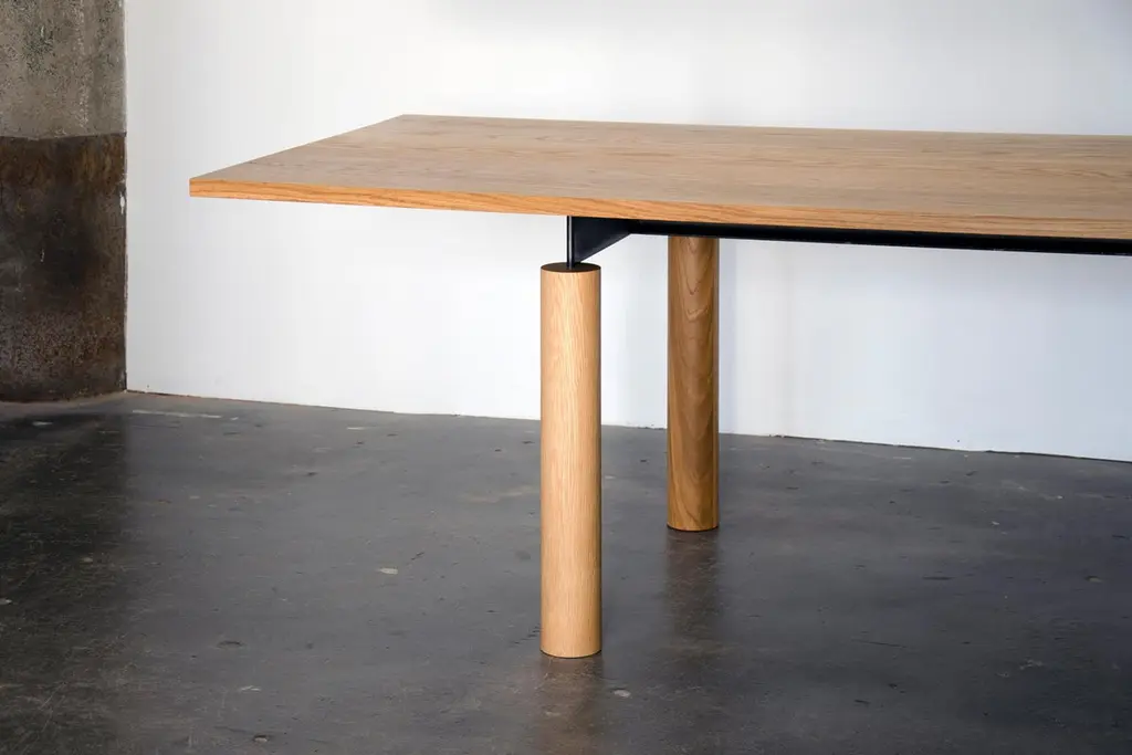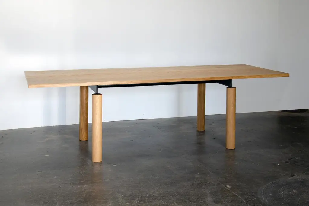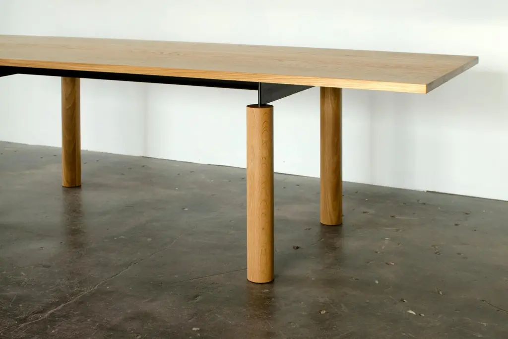 Overpass is a contemporary table inspired by the simple forms and robust construction of freeway interchanges. Foregrounding the natural beauty of solid wood, a blackened steel chassis gracefully connects a thick tabletop to pillar-like legs. The steel structure allows for custom lengths of up to 18 ft. using only four legs. Despite the mass and weight of the elements, the table has an airy aspect which, from certain angles, gives the impression of a levitating top. The minimal design makes this piece well suited to a variety of interiors. It works equally well as a residential dining table and in a commercial setting as a conference table.