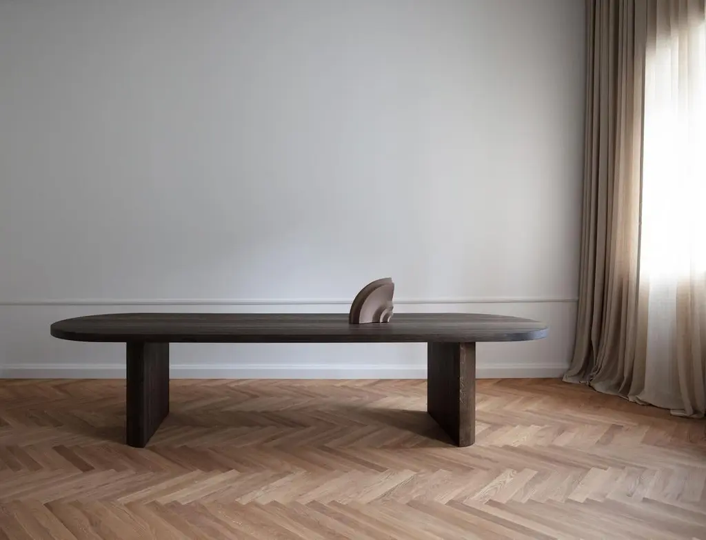 Dining room table 'Evoke' designed by Ida L. Hildebrand for Friends & FoundersModel shown on main picture:- Shape: Rounded- Dimensions: H. 75 x 300 x 100 cm- Wood finish: Smoked OakSizes available:300 x 100 cm340 x 100 cmWood finishes available: Smoked oak / Natural oak---IDA LINEA HILDEBRANDCreative Director and Co-founder of Friends Founders Architect and designer Ida Linea Hildebrand was born in Stockholm in 1978. The daughter of a cabinet maker, she continued the family tradition by choosing a path that led her to furniture design. In 2008 Ida Linea graduated from the distinguished Stockholm art academy Konstfack (the University of Arts, Crafts, and Design). She earned a Master’s Degree in Fine Arts within the field of Interior Architecture and Furniture Design.After studying, Ida Linea moved to Copenhagen – a mecca for contemporary furniture design – and there her dream of becoming an independent designer took shape. She met future husband and co-founder of Friends & Founders, Rasmus Hildebrand, and the couple established a studio in 2013. At that creative space in the north of Copenhagen the universe of Friends & Founders’ design took shape.
