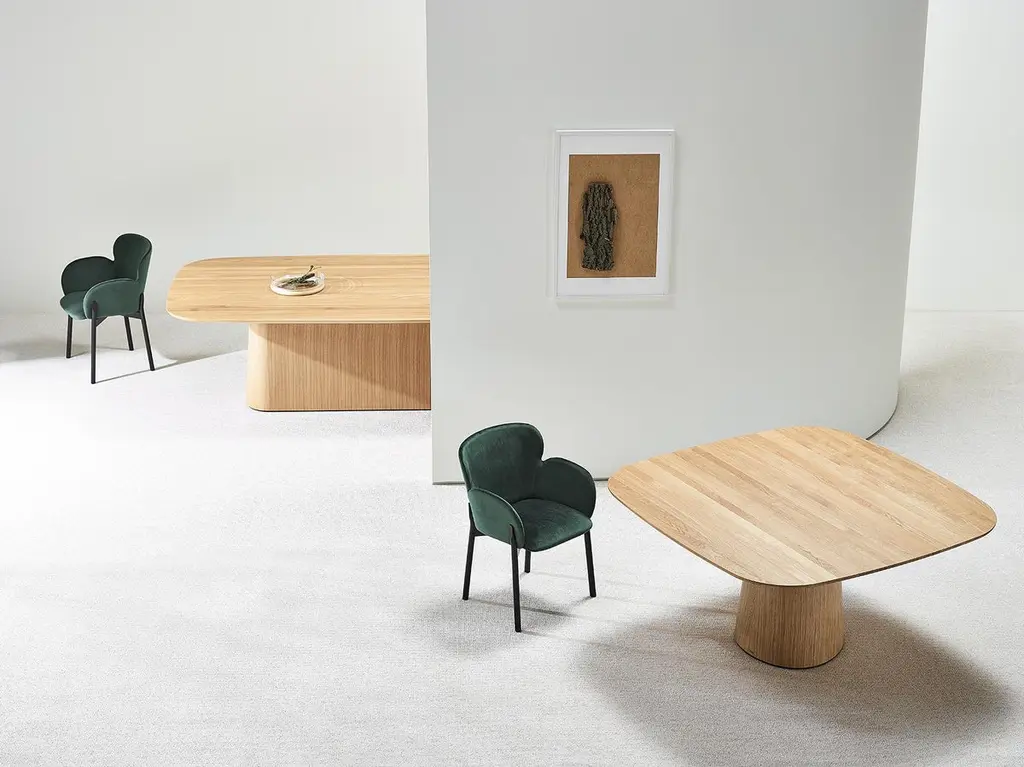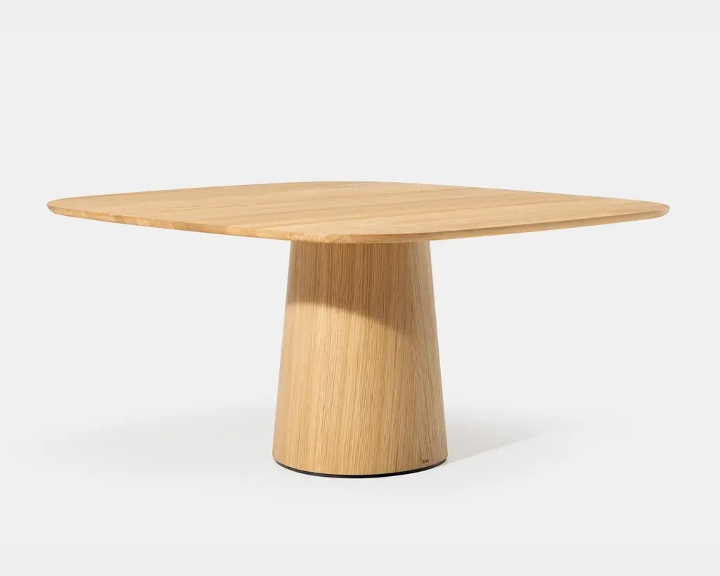 Dining table POV 462 signed by TON & Kashkash studioTop shape:Round, square, or rounded squareTop size:120cm, 130cm,140cm, or 150cmWood types:Solid oak or American walnut--The P.O.V. collection features a modular design and an organically shaped table base. While it may look discreet, a P.O.V. table has the potential to command a room – it all depends on your point of view. P.O.V. tables come in two heights, three base types and six tabletop shapes. The modular system boasts dozens of options, making it suitable for almost any interior – an office, dining hall, cafe or restaurant. The collection includes a stackable dining stool of the same name, which serves both a functional as well as a playful role. The collection is available in three types of wood – beech, oak and American walnut – and finished in various colors.
