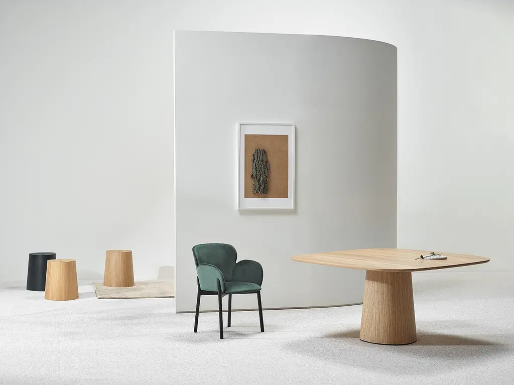 Dining table POV 462 signed by TON & Kashkash studioTop shape:Round, square, or rounded squareTop size:120cm, 130cm,140cm, or 150cmWood types:Solid oak or American walnutThe P.O.V. collection features a modular design and an organically shaped table base. While it may look discreet, a P.O.V. table has the potential to command a room – it all depends on your point of view. P.O.V. tables come in two heights, three base types and six tabletop shapes. The modular system boasts dozens of options, making it suitable for almost any interior – an office, dining hall, cafe or restaurant. The collection includes a stackable dining stool of the same name, which serves both a functional as well as a playful role. The collection is available in three types of wood – beech, oak and American walnut – and finished in various colors.