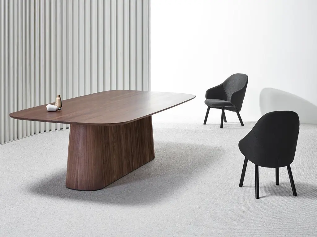 Dining table POV 466 signed by TON & Kashkash studioTop shape:Oval, rectangular, or round rectangularTop size:220cm, 240cm, 260cm, 280cm or 300cmWood types:Solid oak or American walnutModel quoted : Ovale top, walnut, 220 cmThe P.O.V. collection features a modular design and an organically shaped table base. While it may look discreet, a P.O.V. table has the potential to command a room – it all depends on your point of view. P.O.V. tables come in two heights, three base types and six tabletop shapes. The modular system boasts dozens of options, making it suitable for almost any interior – an office, dining hall, cafe or restaurant. The collection includes a stackable dining stool of the same name, which serves both a functional as well as a playful role. The collection is available in three types of wood – beech, oak and American walnut – and finished in various colors.
