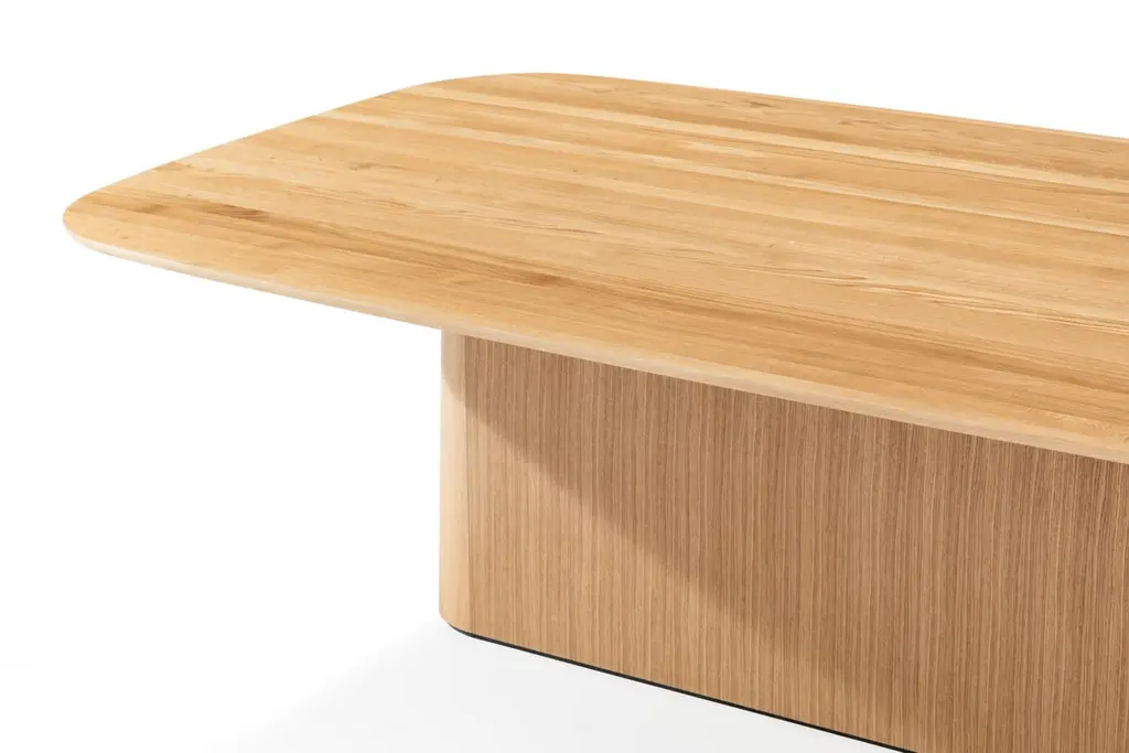 Dining table POV 466 signed by TON & Kashkash studioTop shape:Oval, rectangular, or round rectangularMeasures: Top size:220cm, 240cm, 260cm, 280cm or 300cmWood types:Solid oak or American walnutModel quoted: Rectangular top or round rectangular, solid oakThe P.O.V. collection features a modular design and an organically shaped table base. While it may look discreet, a P.O.V. table has the potential to command a room – it all depends on your point of view. P.O.V. tables come in two heights, three base types and six tabletop shapes. The modular system boasts dozens of options, making it suitable for almost any interior – an office, dining hall, cafe or restaurant. The collection includes a stackable dining stool of the same name, which serves both a functional as well as a playful role. The collection is available in three types of wood – beech, oak and American walnut – and finished in various colors.