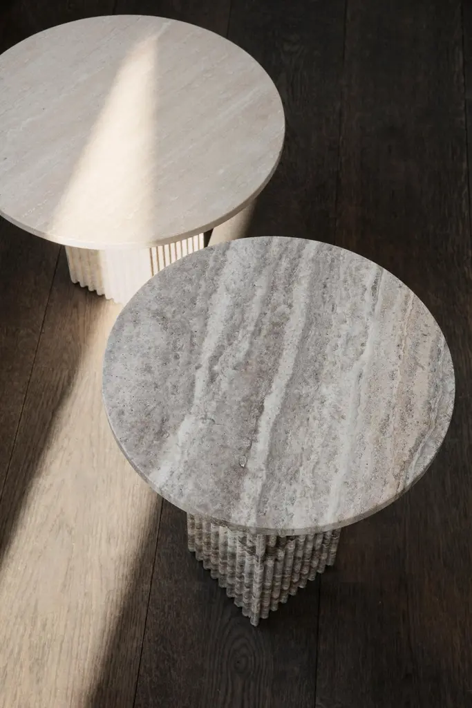 SOHO GREY DINING TABLE BY NORR11Design: Kristian Sofus Hansen and Tommy Hyldahl, 2023Materials:Artificial stone grey travertine slabs base with filt finishing, grey travertine tabletop, unfinishedDining table dimensions: Diameter: 120 cm Height: 74cmAlso available in a Grey Coffee Table version : - Low: Diameter: 50 cm Height: 35 cm- Tall: Diameter: 40 cm Height: 50 cmSOHO COLLECTIONRich on architectural references, the Soho collection reminisces architectural building facades to create a vertical and slim table design. The fluted surface of natural stone adds a tactile feeling, while shadows change depth and character of the stone surface throughout the day.Soho is made from grey travertine with a beautiful natural surface of small holes and incorrections. Made from grey travertine plates, the table remains lightweight and easy to move around.Product facts:Surface can be slightly uneven and the color may vary little due to its unique textureAdds a sculptural and organic detail to any interior spaceFilt finishing on the bottom to prevent scratches on the floor