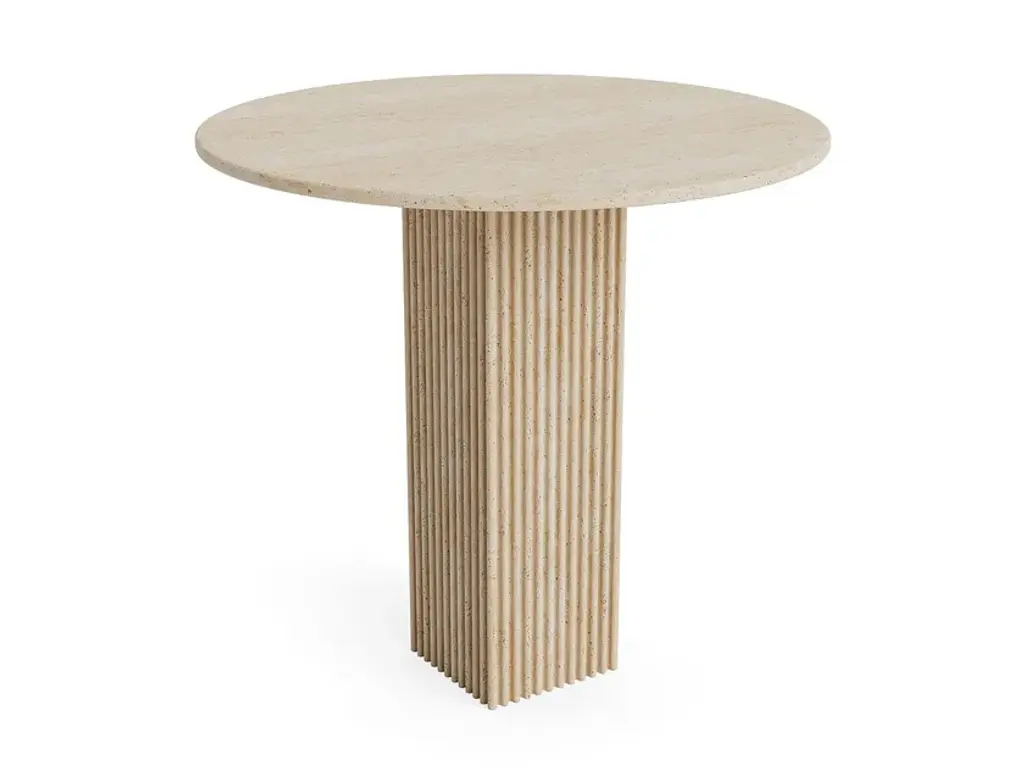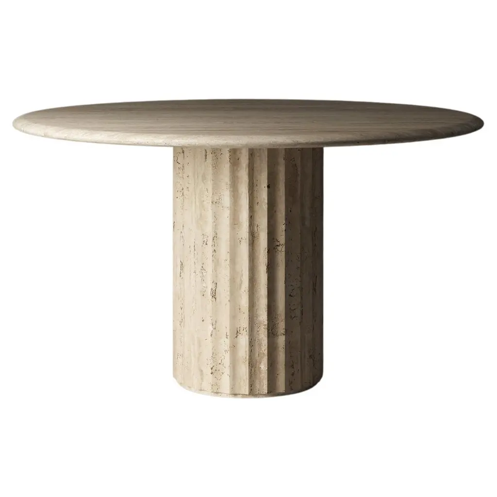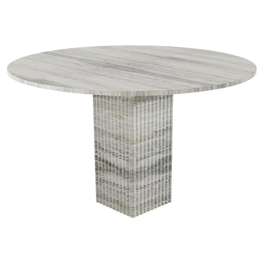 SOHO GREY DINING TABLE BY NORR11Design: Kristian Sofus Hansen and Tommy Hyldahl, 2023Materials:The tabletop is made of travertine and the table base is made of travertine slabs with artificial stone core. The surface of the table is polished and the table top treated with a stone impregnator that provides a protective seal.Dining table dimensions: Diameter: 140 cm Height: 74cmAlso available in 120cm DiameterSOHO COLLECTIONRich on architectural references, the Soho collection reminisces architectural building facades to create a vertical and slim table design. The fluted surface of natural stone adds a tactile feeling, while shadows change depth and character of the stone surface throughout the day.Soho is made from grey travertine with a beautiful natural surface of small holes and incorrections. Made from grey travertine plates, the table remains lightweight and easy to move around.Product facts:Surface can be slightly uneven and the color may vary little due to its unique textureAdds a sculptural and organic detail to any interior spaceFilt finishing on the bottom to prevent scratches on the floor