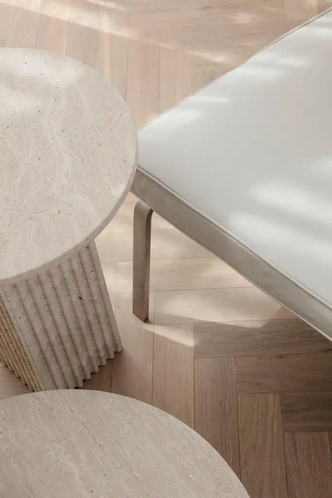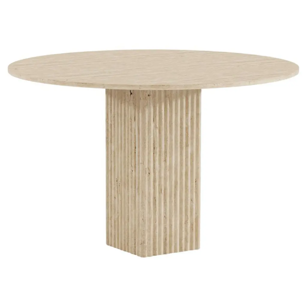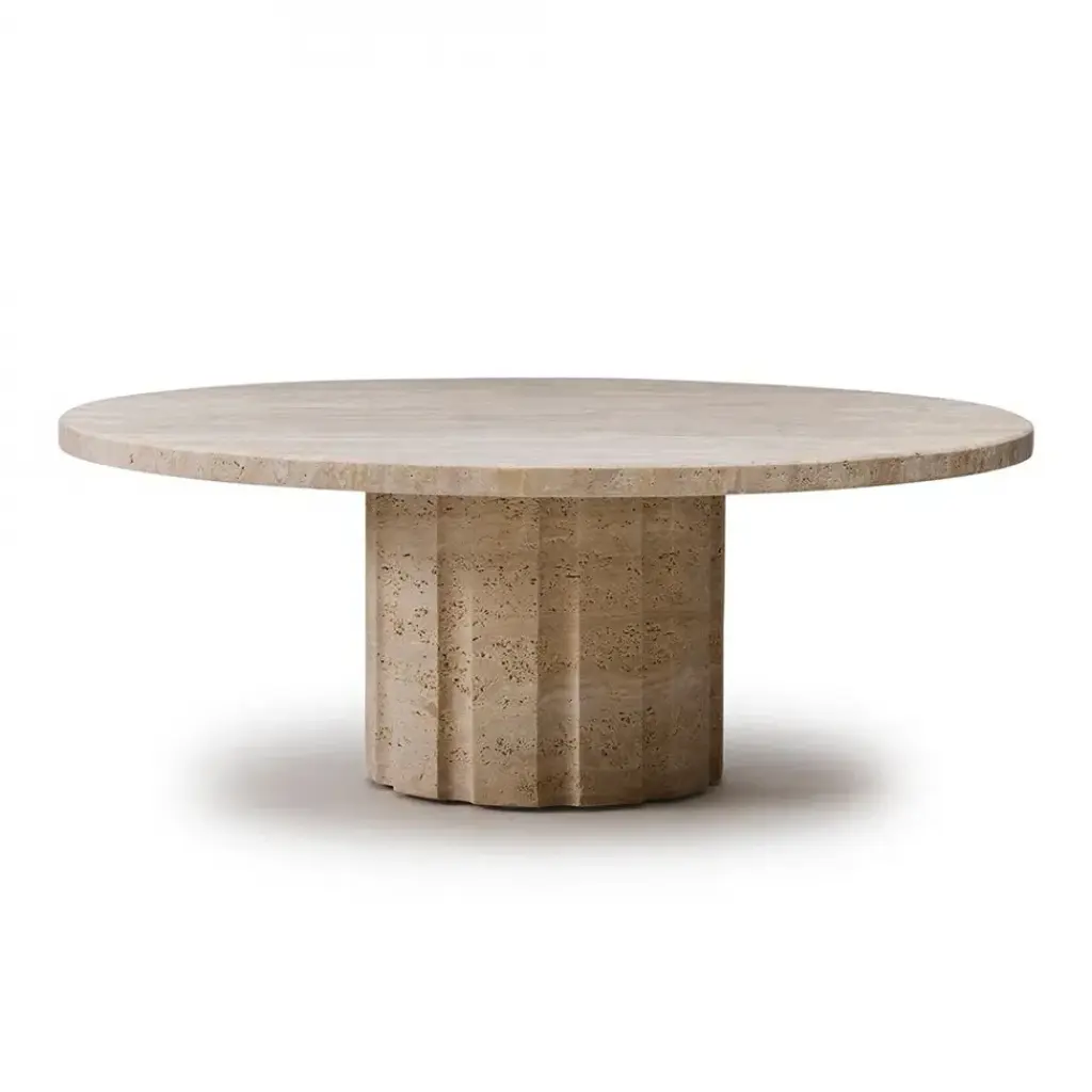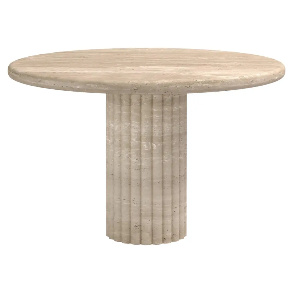 SOHO GREY DINING TABLE BY NORR11Design: Kristian Sofus Hansen and Tommy Hyldahl, 2023Materials:The tabletop is made of travertine and the table base is made of travertine slabs with artificial stone core. The surface of the table is polished and the table top treated with a stone impregnator that provides a protective seal.Dining table dimensions: Diameter: 140 cm Height: 74cmAlso available in 120cm DiameterSOHO COLLECTIONRich on architectural references, the Soho collection reminisces architectural building facades to create a vertical and slim table design. The fluted surface of natural stone adds a tactile feeling, while shadows change depth and character of the stone surface throughout the day.Soho is made from grey travertine with a beautiful natural surface of small holes and incorrections. Made from grey travertine plates, the table remains lightweight and easy to move around.Product facts:Surface can be slightly uneven and the color may vary little due to its unique textureAdds a sculptural and organic detail to any interior spaceFilt finishing on the bottom to prevent scratches on the floor