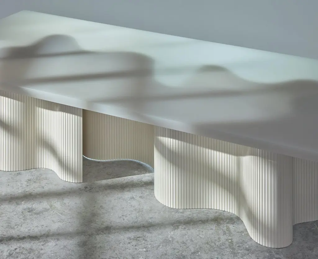Spine is a series of tables consisting of two components, a thin aluminum sheet captured ina cast resin surface. The series is a result of many material explorations concerned with bent forms and enhanced flexibility. The spine of each table is formed from a 10mm plateof aluminum. The aluminum is scored on both sides, allowing for the dramatic curve to be formed. The aluminum is anodized and set in place before the resin surface is cast around the skeletal form. As the resin bonds it constrains the aluminum, suspending the spines´ curve and creating the tables structure. Traces of the organic curve remain visible through the polished resin, its structure evident and essential.