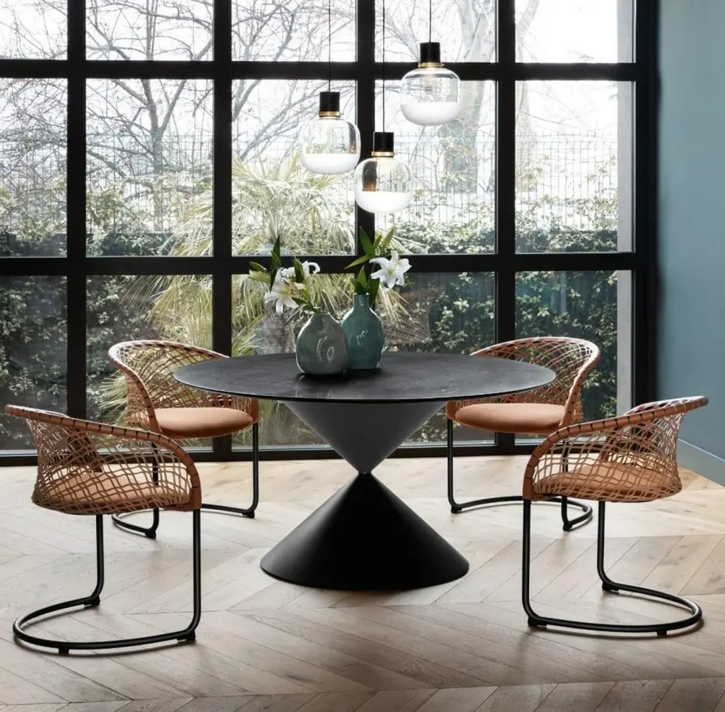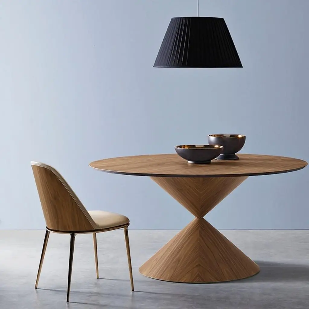The Clessidra dining table by Midj brings an elegant and modern touch to any dining space. Designed by Paolo Vernier, this table showcases a striking hourglass-shaped base with a central ring detail, creating a sculptural and glamorous focal point. Its bold geometry balances rounded forms with sharp angles, while contrasting finishes enhance its visual appeal with dynamic juxtaposition.The spacious round top offers ample room for gathering, making it both functional and inviting. Pair it with classic dining chairs for a refined, cohesive look.Crafted in Italy with exceptional attention to detail, the Clessidra dining table is fully customizable. The top is available in a variety of ceramic finishes, while the base can be tailored with different metal and wood options. The central ring is also offered in multiple metal colors, allowing for a personalized design to suit any space.We will be glad to check with the factory’s technical team if sizes, finishes, and colors can be customized. We do our best to expedite production and to ship and deliver product within the listed lead time, however current lead times might be longer due to global shipping backlog and delays. These delays are out of our control and cannot be a reason to cancel an order.