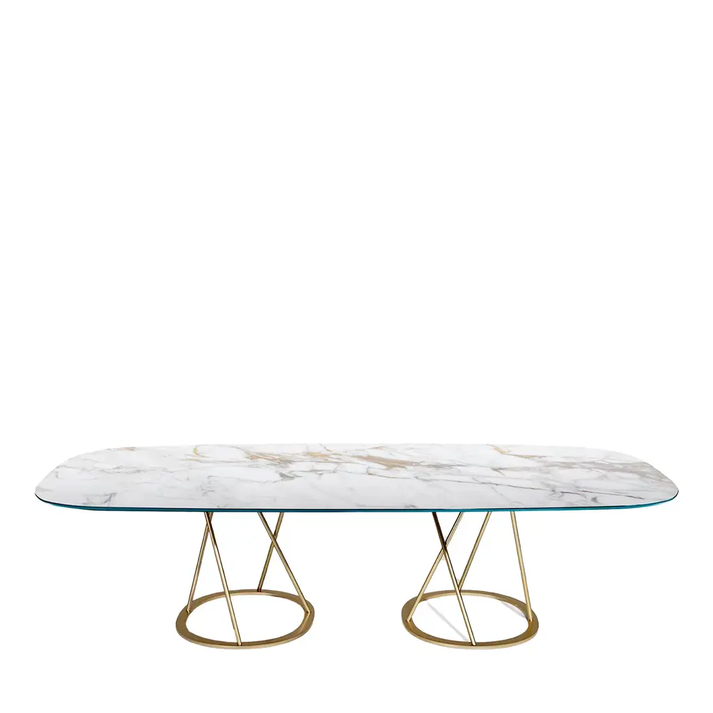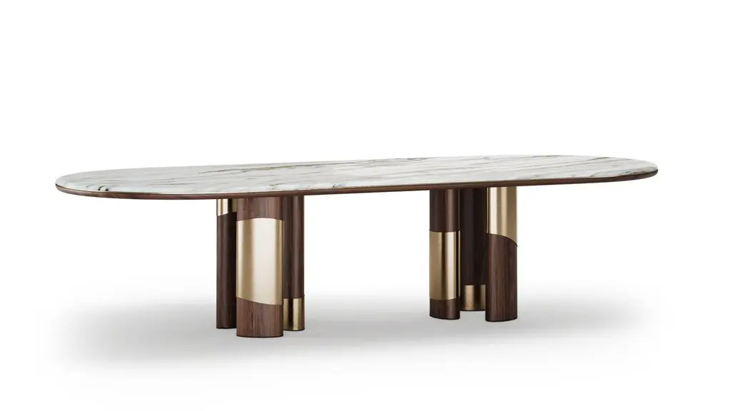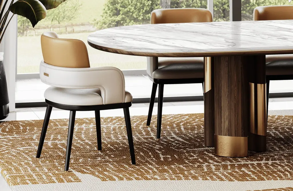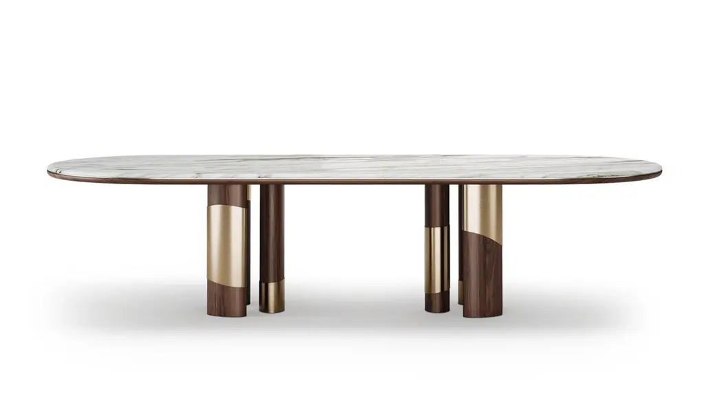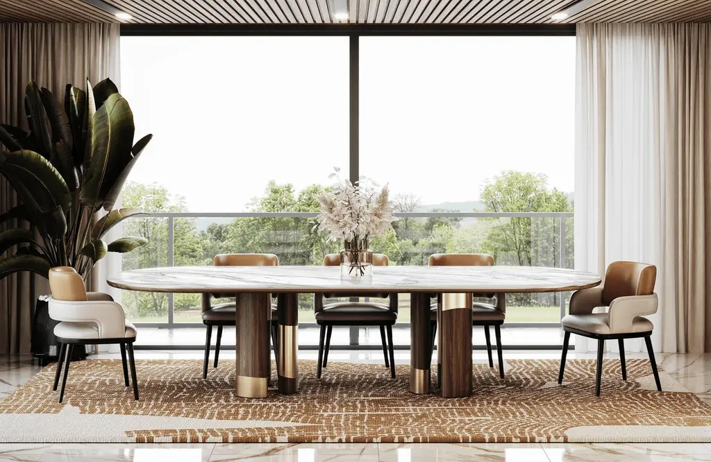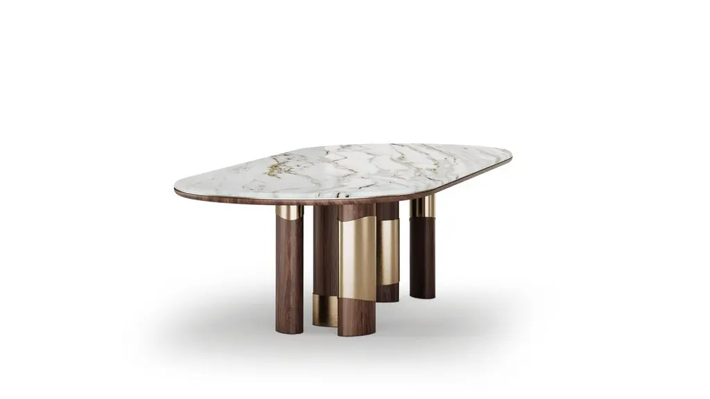 Bold and architectural, the Korin dining table has a sophisticated design. Crafted in rich walnut wood, its standout feature is the brushed brass detailing that encircles the legs, creating a sculptural visual rhythm. The Calacatta Gold marble top crowns the structure with a luminous, veined surface that radiates elegance and restraint. Korin is a statement piece meant for curated dining spaces, blending organic warmth with modern geometry. It balances material contrast with seamless design, turning every meal into a refined experience. A table where artistry and function coexist in perfect harmony.