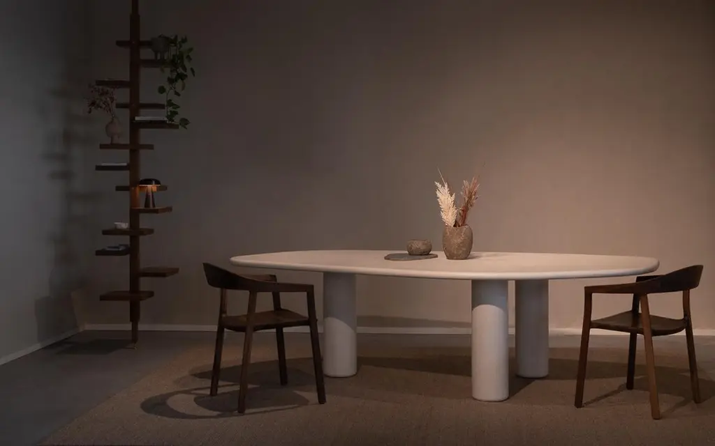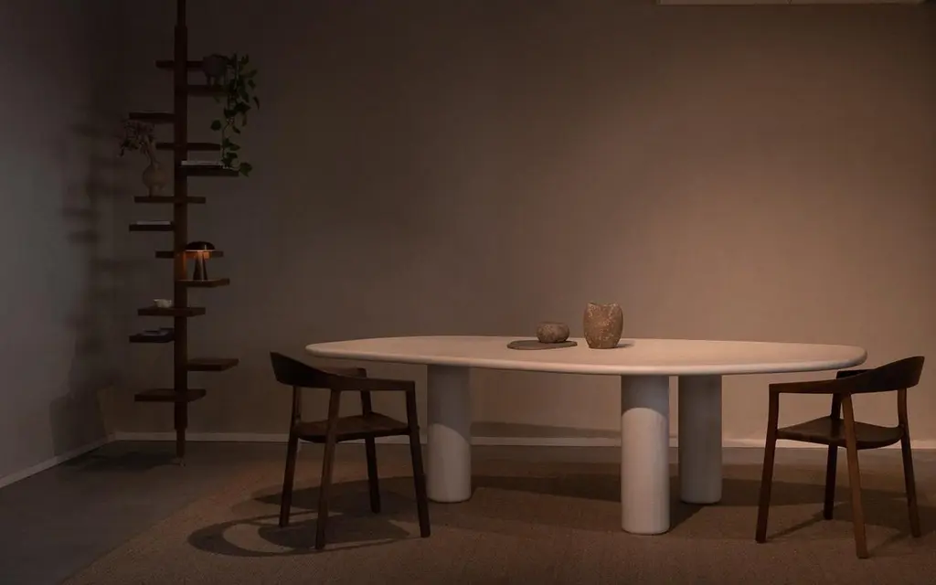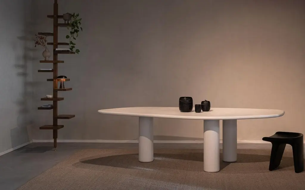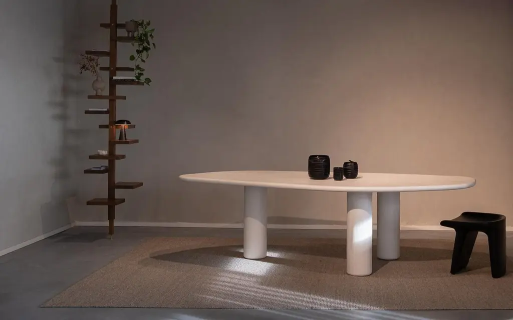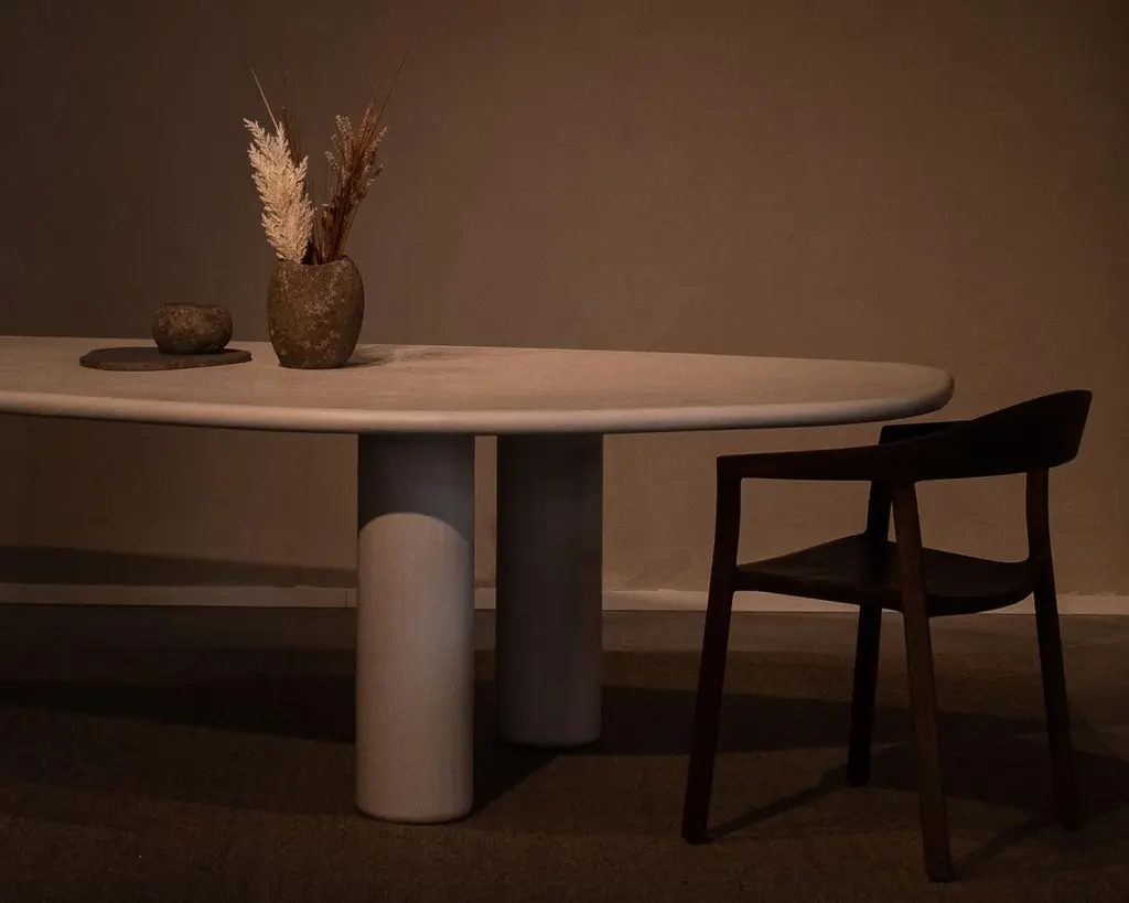 The Vézère collection pays homage to the French river, with its gentle curves and fluid forms. Organic and flowing lines. The shape of the tables was created from pebbles found in the river. Starting from a base of plywood, layers of Mortex© are added to create the table. Mortex© is a decorative technique based on lime, acrylic and pigment. This technique is added manually which gives an imperfectly perfect result and gives each table a unique appearance with color nuances, imperfections and small irregularities. These form the character of the product and the technique. The appearance of the furniture is partly determined by the degree of polishing and the final finishing layer. Each piece of furniture or object is completely unique and handmade in our own workshop. Matt finish by means of a water-based PU lacquer. The colors are manually composed of natural pigments.Only for indoor use. Material: Ply wood, Mortex© (decorative technique based on lime and pigment) Armand & Francine (A&F) is a creative duo comprised of Gert Hellebaut and Cathy Poppe, based in Ghent, Belgium. Driven by a desire for creative freedom, they embarked on a journey as self-taught designers which led them to establish their studio where they handcraft solid, unique furniture and objects for interiors. A&F combine traditional craftsmanship with organic and flowing lines, reflecting their love for textures, materials, asymmetry, and imperfect beauty. Cathy's creative instincts and Gert's technical skills complement each other, resulting in their distinctive and refined designs. A&F believes that furniture should not only be visually appealing but also serve as functional and emotional objects that can be cherished for generations. The design process of A&F involves experimentation and refinement, always researching new techniques, structures and materials. Armand & Francine believe in a local approach and prioritize quality and craftmanship, personally handling every aspect of the production process in favor of maintaining control over the final product.