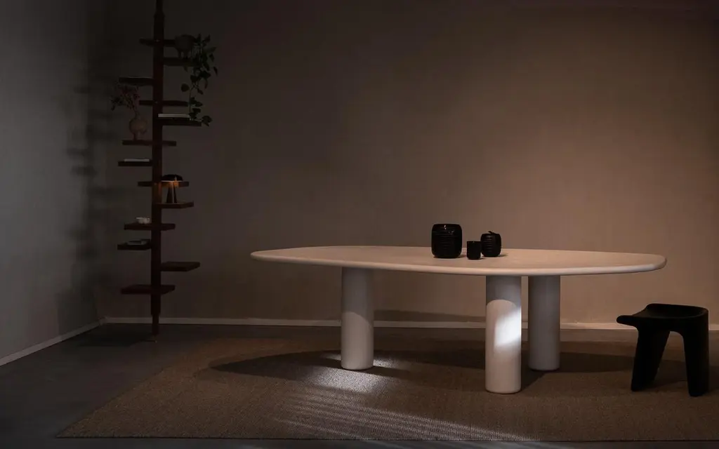 The Vézère collection pays homage to the French river, with its gentle curves and fluid forms. Organic and flowing lines. The shape of the tables was created from pebbles found in the river. Starting from a base of plywood, layers of Mortex© are added to create the table. Mortex© is a decorative technique based on lime, acrylic and pigment. This technique is added manually which gives an imperfectly perfect result and gives each table a unique appearance with color nuances, imperfections and small irregularities. These form the character of the product and the technique. The appearance of the furniture is partly determined by the degree of polishing and the final finishing layer. Each piece of furniture or object is completely unique and handmade in our own workshop. Matt finish by means of a water-based PU lacquer. The colors are manually composed of natural pigments.Only for indoor use. Material: Ply wood, Mortex© (decorative technique based on lime and pigment) Armand & Francine (A&F) is a creative duo comprised of Gert Hellebaut and Cathy Poppe, based in Ghent, Belgium. Driven by a desire for creative freedom, they embarked on a journey as self-taught designers which led them to establish their studio where they handcraft solid, unique furniture and objects for interiors. A&F combine traditional craftsmanship with organic and flowing lines, reflecting their love for textures, materials, asymmetry, and imperfect beauty. Cathy's creative instincts and Gert's technical skills complement each other, resulting in their distinctive and refined designs. A&F believes that furniture should not only be visually appealing but also serve as functional and emotional objects that can be cherished for generations. The design process of A&F involves experimentation and refinement, always researching new techniques, structures and materials. Armand & Francine believe in a local approach and prioritize quality and craftmanship, personally handling every aspect of the production process in favor of maintaining control over the final product.