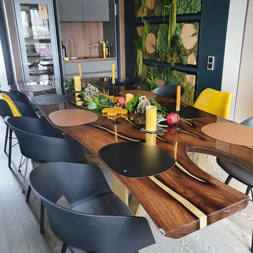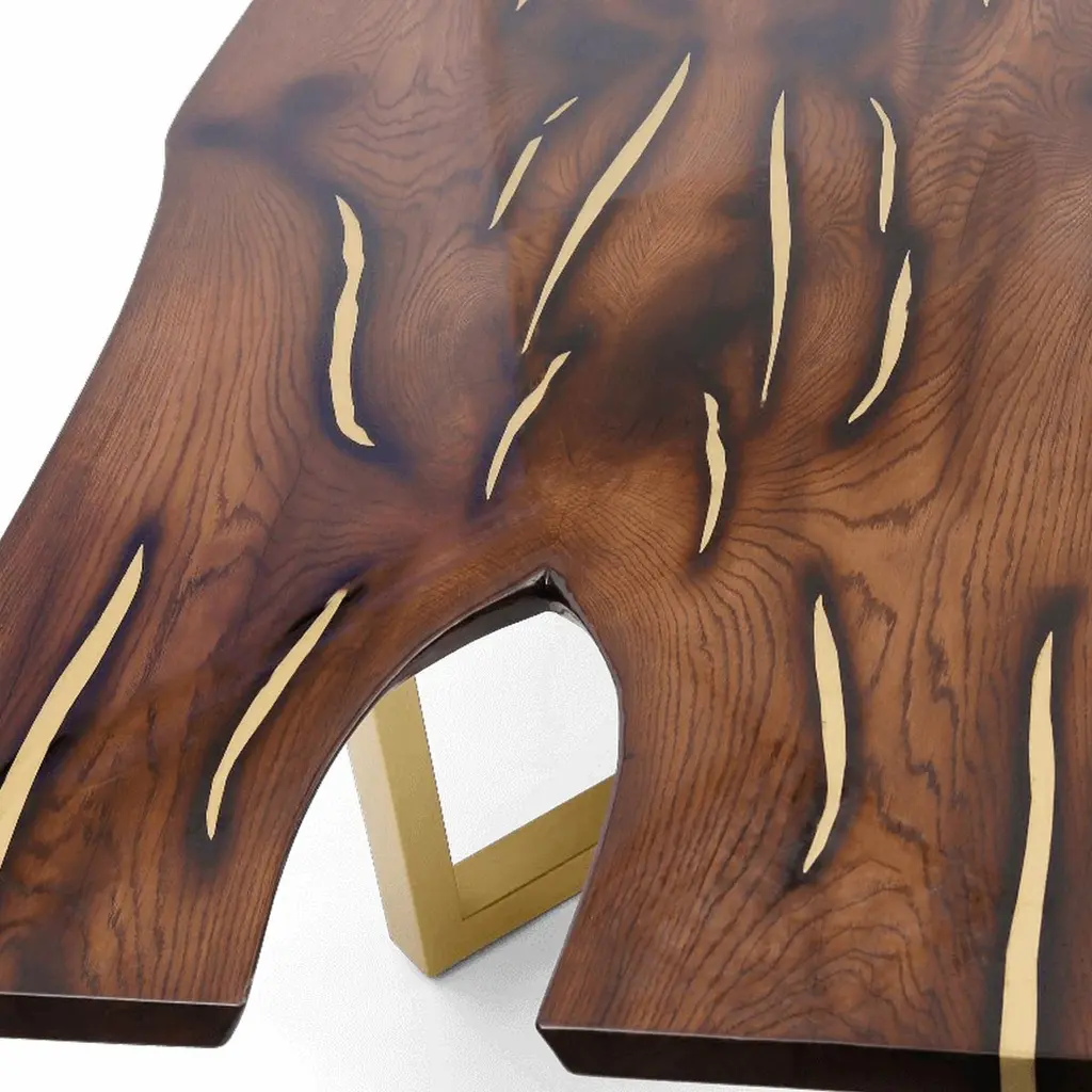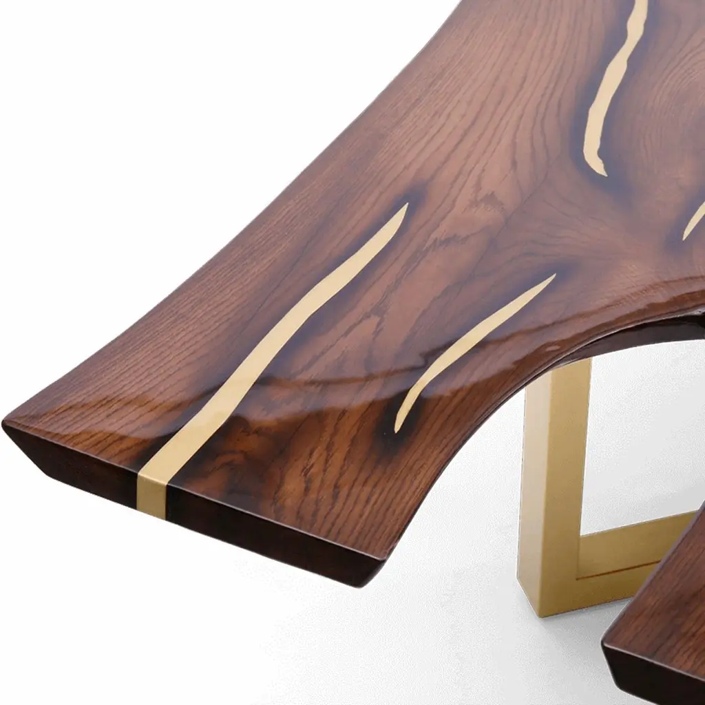 An eye-catching interplay of shapes and proportions, this dining table encompasses fine craftsmanship and an innovative design that will enhance any modern dining room. This modern live edge dining table is handmade from old, reclaimed oak with many fine brass inlays on top and finished with 3 coats of clear epoxy resin. This table with super high gloss finish is seated on modern brass legs. Due to wood structure and shape each table is one of a kind, truly unique. CUSTOMIZATION AVAILABLE - Different colors, materials, finishes and customized sizes available upon request. If you’re interested in a customization that is not currently listed, please contact Kanttari.BESPOKE – We do create individual and fully customized designs. Please contact Kanttari to discuss your specifications.MANUFACTURING – we fully hand-craft each piece in our workshop by our best craftsmen. Production lead time may take up to 9 - 12 weeks, bespoke items may be longer – depending on the exact specification and availability of materials chosen. For more information please contact Kanttari.SHIPPINGCarefully packaged in wooden crate.Fully insured.Request a customized shipping quote.