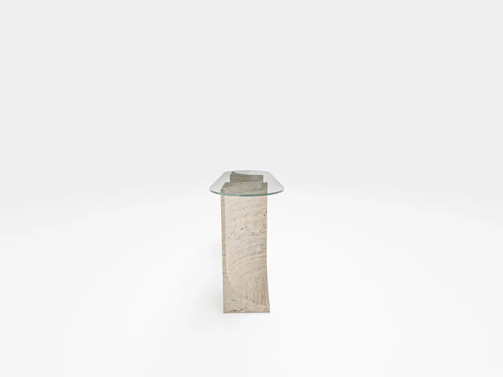 Contemporary Modern Edge Console Console Table in Travertino Marble by Ferriani Bolgi for Collector StudioFamily of coffee tables, console and dining tables characterized by an architectural and sculptural base, combined with a glass top.DIMENSIONSW 130 cm 51″D 45 cm 18”H 80cm 31”PRODUCT FEATURESTable top in glass or cast glass.Leg in travertino.PRODUCT OPTIONSGLASS FINISHES:Available in glass or cast glass.LEG FINISHES:Available in all COLLECTOR wood swatches.Available in all COLLECTOR marble swatches.About COLLECTORThe Collector brand was born and Portugal and aims to be part of daily life by fusing furniture to home routines and lifestyles. The company designs its pieces with the intention to embrace diverse styles and to blend in inside any contemporary setting.A wide range of product typologies are designed to work in diverse layers of importance. The result is a clean-lined furnishing collection that can easily be customised to work specifically and according to each unique need, reflecting traditional methods of furniture manufacturing with accurate industrial production methods. Collector strives to achieve the best quality possible by selecting the best materials and by the constant development of production processes and manufacturing partnerships.For more information please visit our website collectorgroup(.)pt