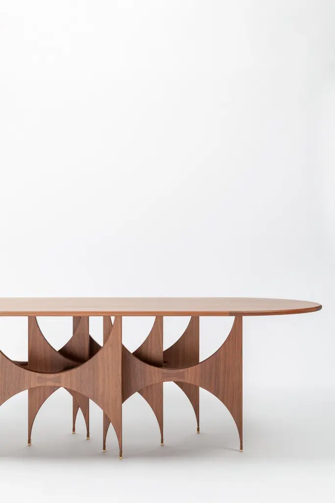 The 'Butterfly in the dining table version made of solid wood is a project that Hannes Peer together with Claudio Spotti of SEM have been pursuing for a long time. The final decision came in view of the Salone 2021. The aim was to create a piece of furniture that was aesthetically the child of the iconic 'Butterfly' console but constructively it had to be diametrically opposed. The 'Butterfly' Dining Table is in fact made with several layers of solid poplar wood composed as a structure and receives its external finish with a 'Masselletto' of Canaletto Walnut with a velvety surface. An immediately visible detail is the so called 'Butterfly' Joint at the center of each leg that characterizes this design object and renders it unique. These joints are typical for Japanese carpentry that Hannes Peer had the possibility to get to know 'first hand' as he has been carrying out several architectural projects in Japan. Top-level craftsmanship and attention to detail and material define this design piece and make it a piece de resistance for every interior project.Costumized sizes, colors and top available on request.