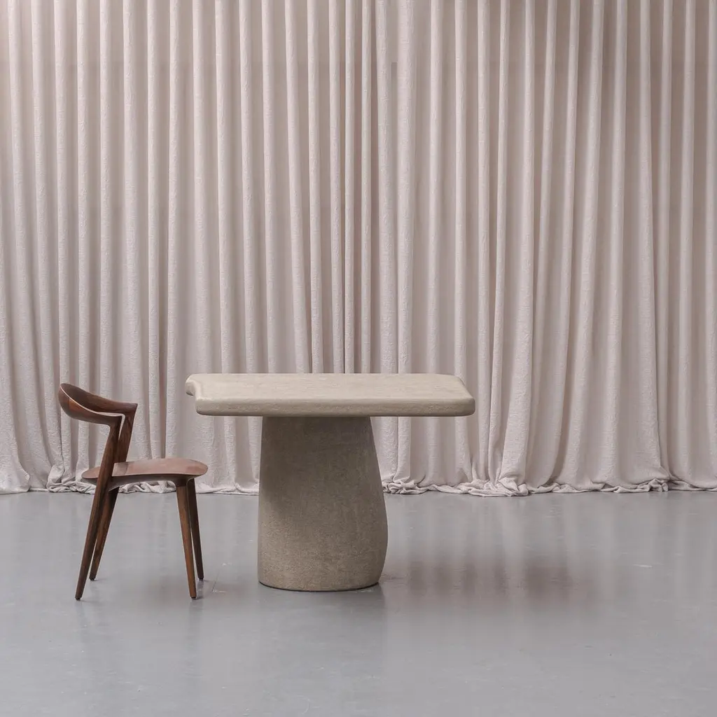 Starting from a base of plywood, layers of Mortex© are added to create the table. Mortex© is a decorative technique based on lime, acrylic and pigment. This technique is added manually which gives an imperfectly perfect result and gives each table a unique appearance with color nuances, imperfections and small irregularities. These form the character of the product and the technique. The appearance of the furniture is partly determined by the degree of polishing and the final finishing layer. Each piece of furniture or object is completely unique and handmade in our own workshop. Matt finish by means of a water-based PU lacquer. The colors are manually composed of natural pigments.Only for indoor use. Material: Ply wood, Mortex© (decorative technique based on lime and pigment) Armand & Francine (A&F) is a creative duo comprised of Gert Hellebaut and Cathy Poppe, based in Ghent, Belgium. Driven by a desire for creative freedom, they embarked on a journey as self-taught designers which led them to establish their studio where they handcraft solid, unique furniture and objects for interiors. A&F combine traditional craftsmanship with organic and flowing lines, reflecting their love for textures, materials, asymmetry, and imperfect beauty. Cathy's creative instincts and Gert's technical skills complement each other, resulting in their distinctive and refined designs. A&F believes that furniture should not only be visually appealing but also serve as functional and emotional objects that can be cherished for generations. The design process of A&F involves experimentation and refinement, always researching new techniques, structures and materials. Armand & Francine believe in a local approach and prioritize quality and craftmanship, personally handling every aspect of the production process in favor of maintaining control over the final product.