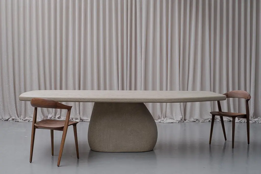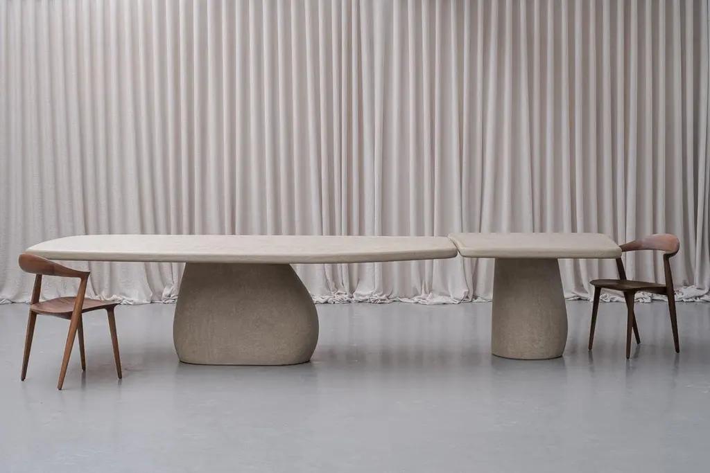 Starting from a base of plywood, layers of Mortex© are added to create the table. Mortex© is a decorative technique based on lime, acrylic and pigment. This technique is added manually which gives an imperfectly perfect result and gives each table a unique appearance with color nuances, imperfections and small irregularities. These form the character of the product and the technique. The appearance of the furniture is partly determined by the degree of polishing and the final finishing layer. Each piece of furniture or object is completely unique and handmade in our own workshop. Matt finish by means of a water-based PU lacquer. The colors are manually composed of natural pigments.Only for indoor use. Material: Ply wood, Mortex© (decorative technique based on lime and pigment) Armand & Francine (A&F) is a creative duo comprised of Gert Hellebaut and Cathy Poppe, based in Ghent, Belgium. Driven by a desire for creative freedom, they embarked on a journey as self-taught designers which led them to establish their studio where they handcraft solid, unique furniture and objects for interiors. A&F combine traditional craftsmanship with organic and flowing lines, reflecting their love for textures, materials, asymmetry, and imperfect beauty. Cathy's creative instincts and Gert's technical skills complement each other, resulting in their distinctive and refined designs. A&F believes that furniture should not only be visually appealing but also serve as functional and emotional objects that can be cherished for generations. The design process of A&F involves experimentation and refinement, always researching new techniques, structures and materials. Armand & Francine believe in a local approach and prioritize quality and craftmanship, personally handling every aspect of the production process in favor of maintaining control over the final product.