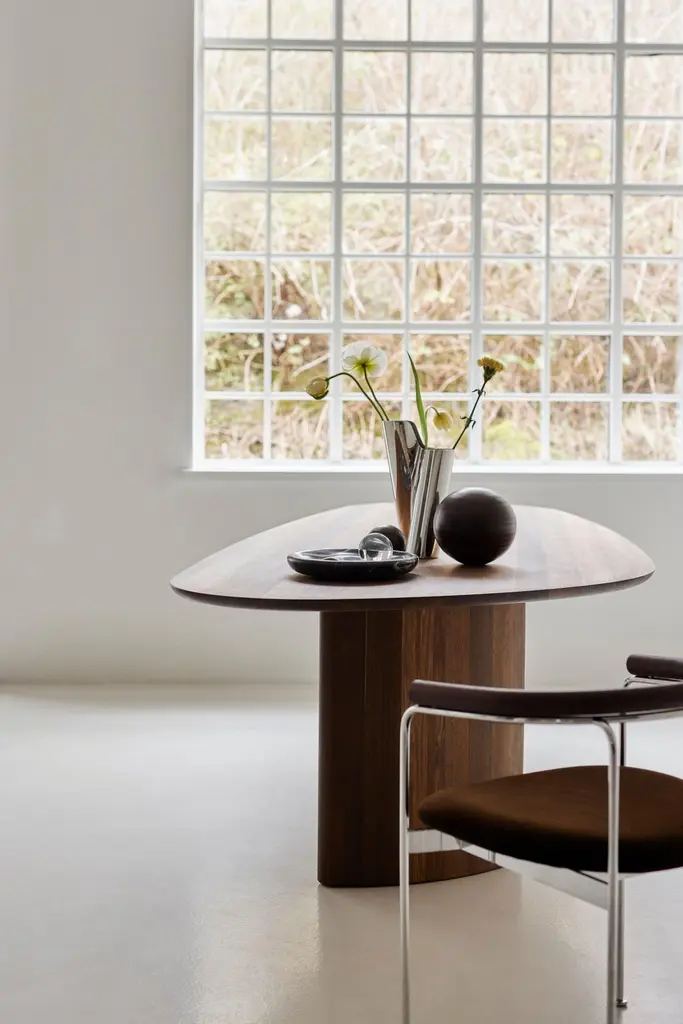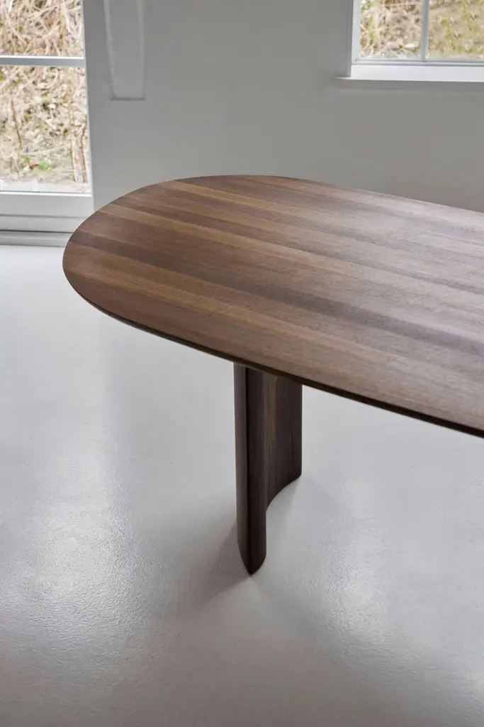 Contemporary Rectangular Dining Table 'Tangent' designed by Anne Boysen for DK3Handmade in DenmarkDimensions:- H.72 x 340 x 110 cm - Big leg: 60 x 24,3 cm / Small leg: 54,8 x 11,8 cm- 3 cm thicknessModel shown on main picture:- Top: Rectangular- Wood: Oak Oil- Size: 340 cmWood finishes available:- Oak- Lacquered Oak- Smoked Oak- Walnut- Lacquered WalnutSizes: - 240 cm- 270 cm- 300 cm- 340 cm- 370 cm- 400 cmTop shapes available:- Round- RectangularPossibility of putting an extension leaf of 50 cm----The Tangent Table is created for dk3 by Danish architect and designer Anne Boysen. The table balances form, function and craftsmanship in a design that appears modern and timeless at the same time. It comes in a rectangular and a round version, each interpreting the distinct and original design characterized by its unique base and asymmetrical tabletop.The form is built entirely from tangential arcs that flow seamlessly into each other, creating a sculptural, well-balanced whole with subtle asymmetry. The tabletop is made of wide solid wood sticks running lengthwise, which gives the table a calm and refined look. The curved edge of the tabletop adds a light and almost floating expression to the table.The dk3 collection combines exclusive classic and contemporary furniture from renowned Danish architects and designers such as Jeppe Utzon, Poul Cadovius, and others. The brand is represented by furniture retailers in more than 30 countries around the world.80% of the dk3 collection is crafted in carpentries in Denmark, while the remainder is produced in workshops across Europe.dk3 creates and produces furniture pieces shaped and crafted by true enthusiasts, always with the ambition to unite the finest carpentry traditions with both modern and classic furniture design, blending timeless steel or brass with high-quality wood. The love for organic materials and the uncompromising focus on quality are evident throughout the entire process, from the initial design sketches to manufacturing in the carpentries, where most pieces are hand-finished and surface-treated